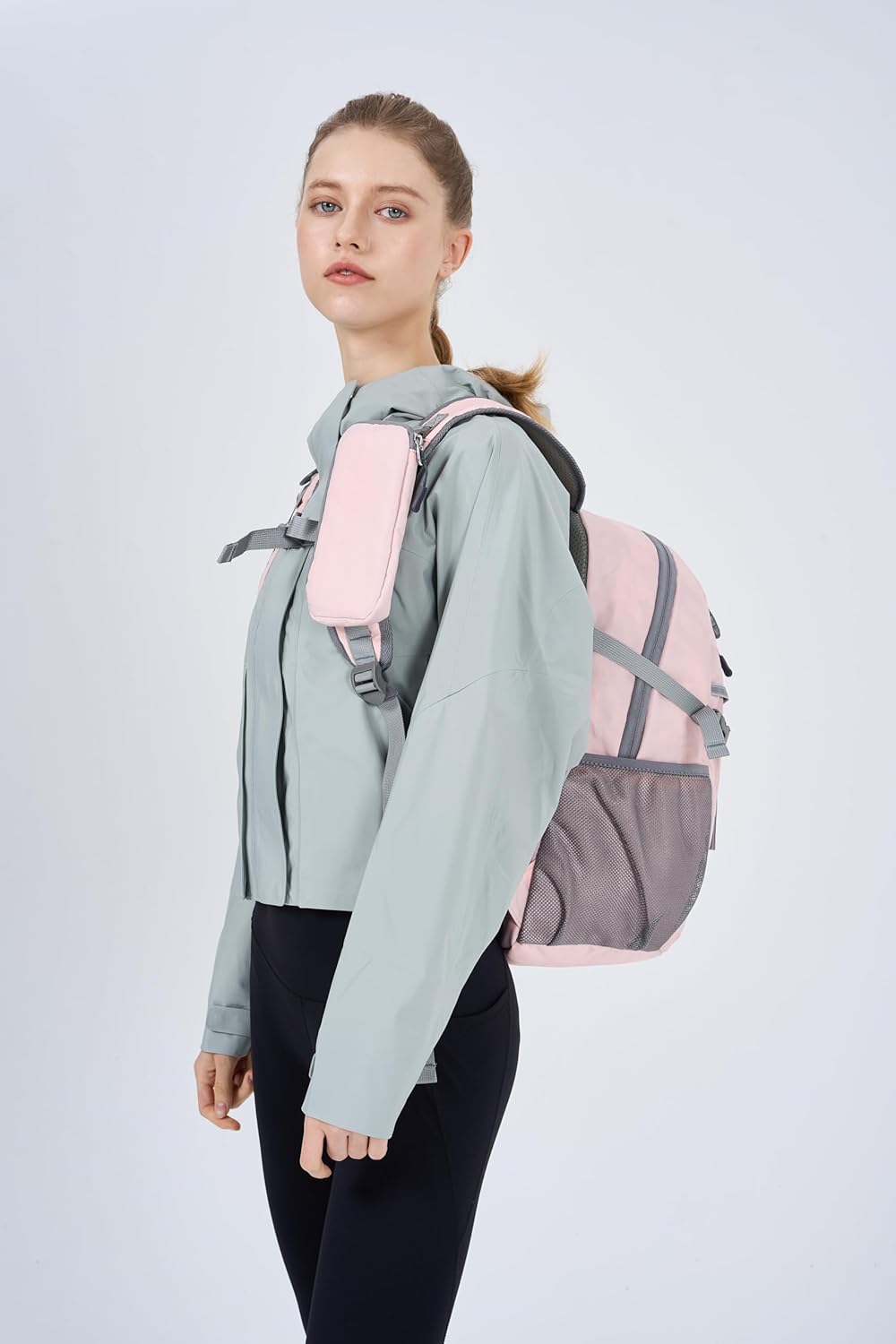 [Practical Details]: The lightweight travel backpack is equipped with two side water bottle pockets for easy hydration. It also includes a headphone port and a key clip for convenient music enjoyment and key storage.