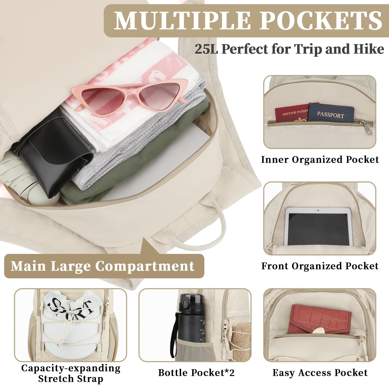 Compact Yet Spacious: This hiking backpack for women combines minimal size with maximum practicality. The 25l main compartment and zippered interior pocket can hold your travel and hiking essentials. Two quick-access front zippered pockets hold your phone, portable charger and more. Two side pockets can easily accommodate large water bottles and umbrellas. An elastic drawstring stores items such as hats or sports protective gear