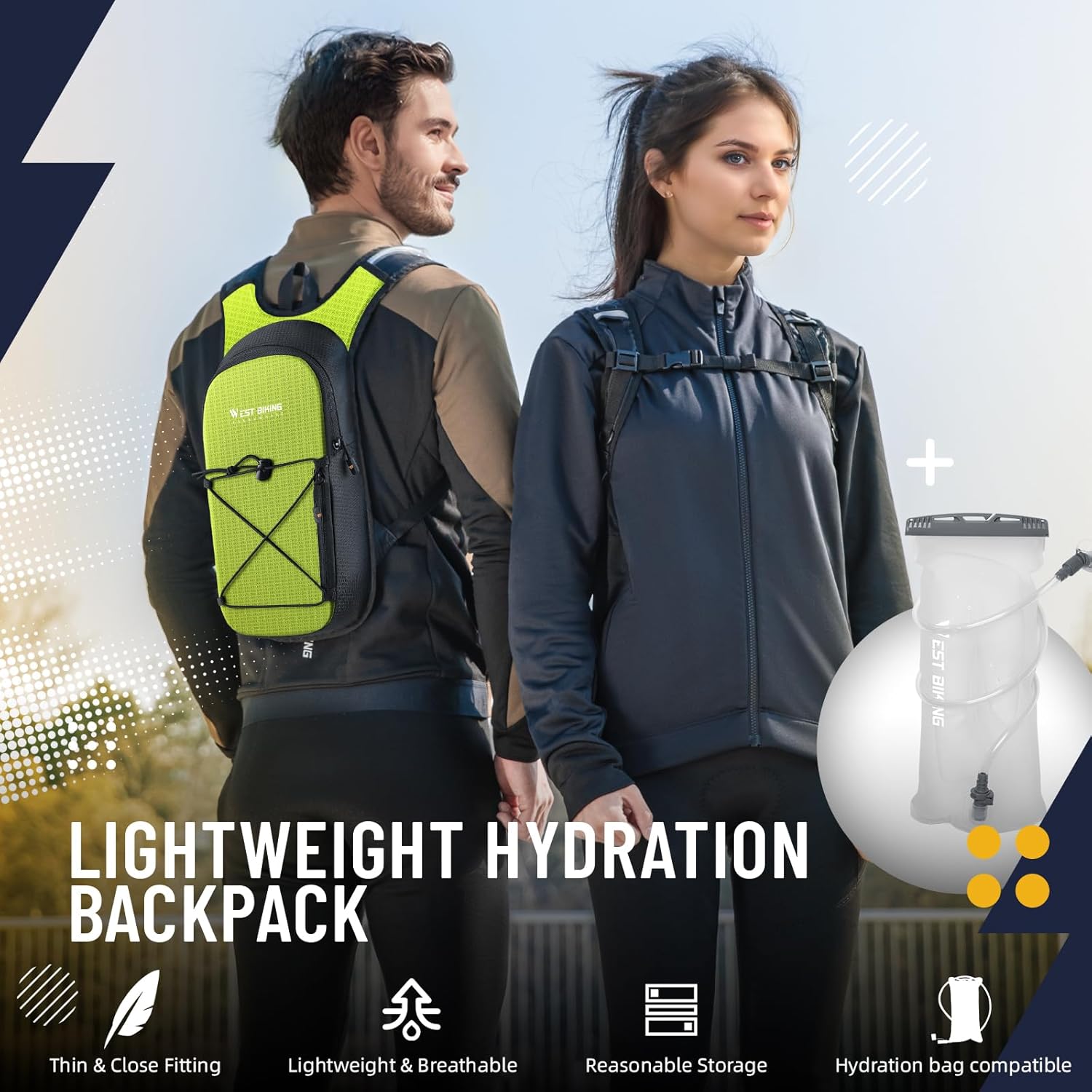 LIGHTWEIGHT & DURABLE HYDRO PACK : Weighing only 0.44 lbs, this hydration pack backpack is crafted from high-quality polyester and PU materials, offering a perfect balance of durability and lightweight comfort. Measuring in at a compact size (15.7×6.3×1.9in) that defies its spacious interior, it effortlessly accommodates a 2L water bladder, transforming into your go-to water pack for hiking, running, or cycling expeditions