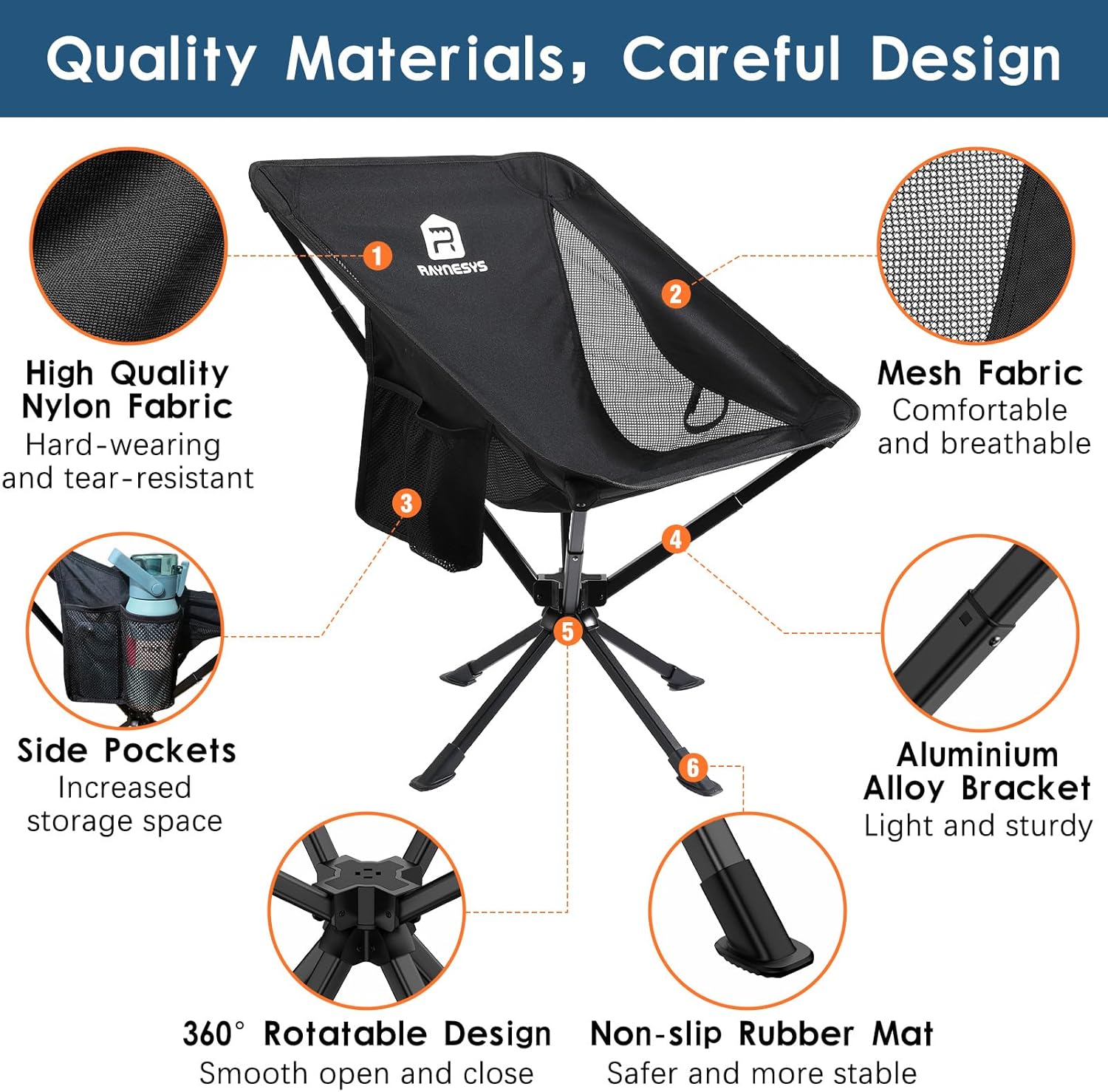 Wide Use: Such a smart and sturdy folding chair is a reliable partner for your outdoor activities. It can easily help you with camping, picnicking, barbecues, fishing, hiking, hunting, watching sports, travelling and so on. Bring more fun. At Raynesys, your satisfaction is our top priority. We provide 24/7 after-sales support. Please feel free to get in touch with us.