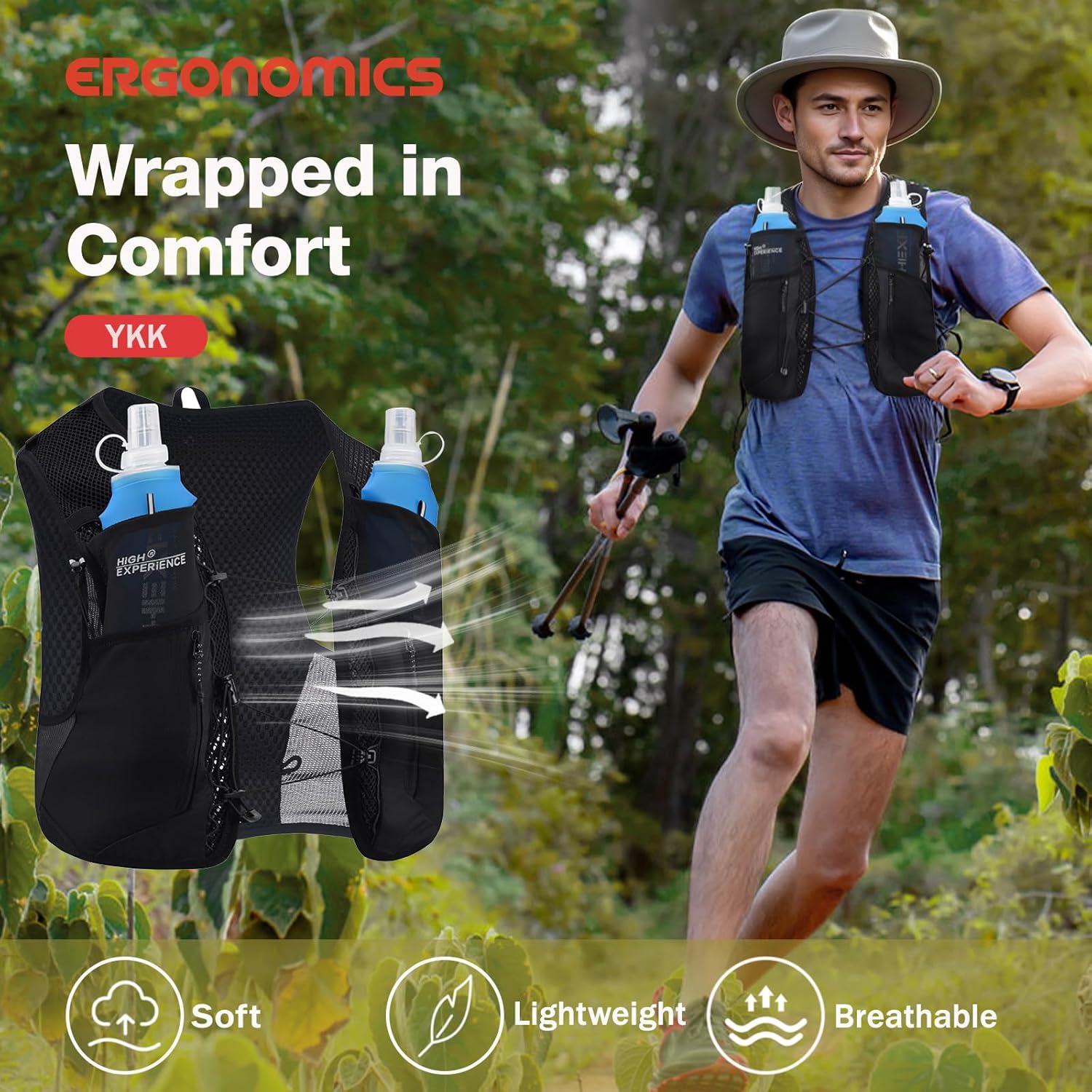 LIGHTWEIGHT BREATHABLE and REFLECTIVE: The fabric of the running hydration vest is made of 100% nylon and features breathable holes, which can accelerate air circulation and absorb moisture and sweat. Reflective elements are added to both the front and back, enhancing safety in rainy and night conditions.