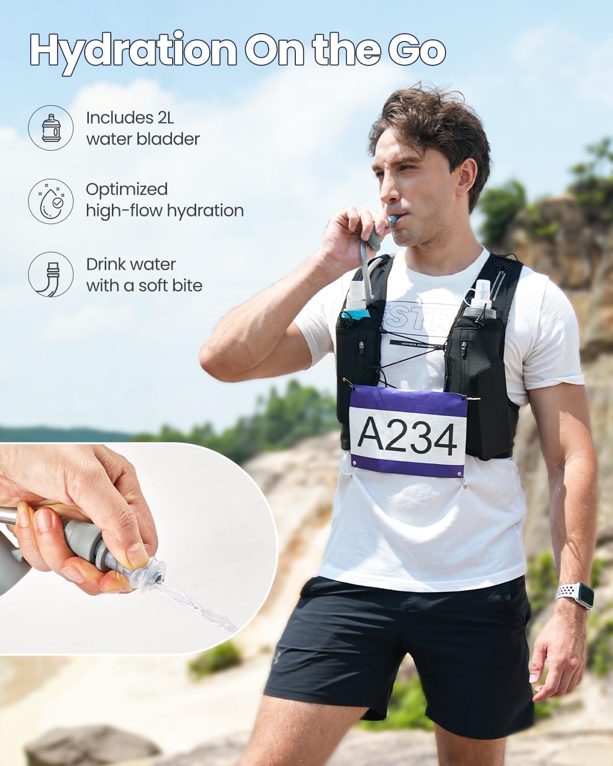 Stay Hydrated on the Run – Zelvot running hydration vest includes a 2L water bladder made from food-grade materials, 100% BPA & PVC-free. Designed with a high-flow bite valve for hands-free drinking, it keeps you hydrated without breaking your stride. To use, simply pull up on the drinking cap, gently bite the mouthpiece to take a sip, and push back to stop the water flow. Perfect for trails, races, and long-distance runs.