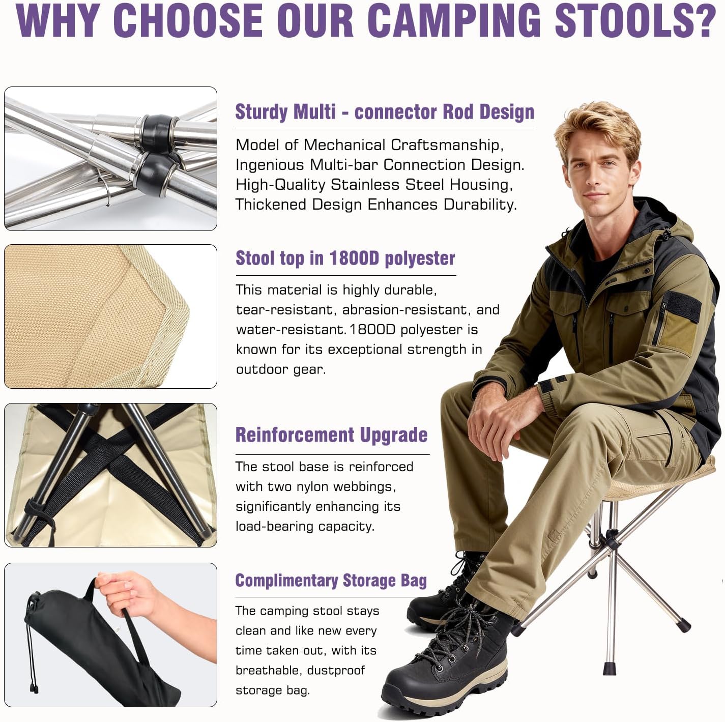 The stool surface is made of ultra durable 1800D tear resistant polyester! Quality can withstand the test of time, ensuring stability and durability.