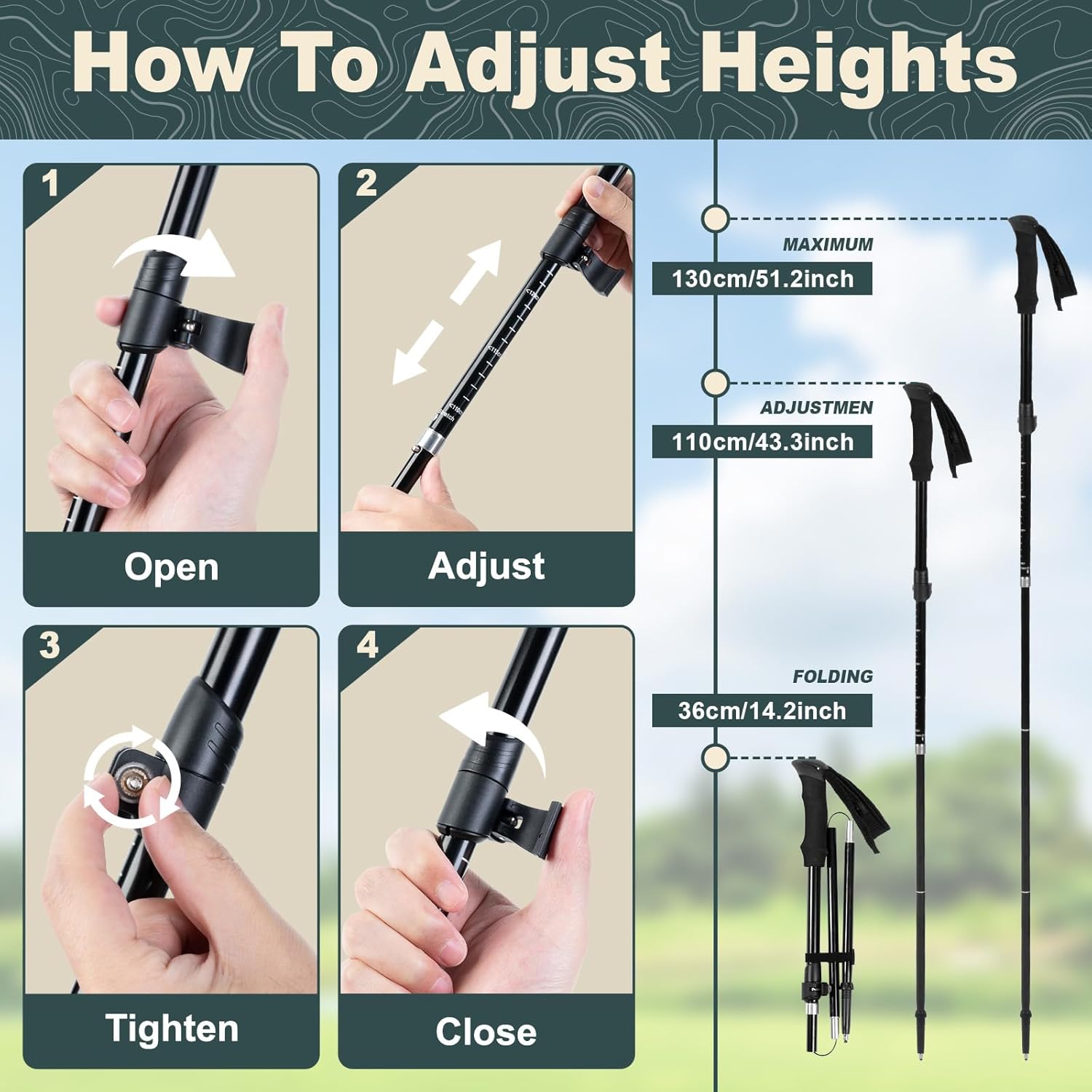 【Peak Adaptivity of All Height and Terrain】 Hiking poles easy to unfold and hiking sticks adjust the length from 42.1″ to 51.2″ to fit your height, trekking poles for hiking come with 2 rubber heads, 2 boot tips, 2 snow baskets, 2 mud baskets accessory and the sporty bag for both hiking sticks, hiking sticks all parts to stay together, hiking poles collapsible lightweight suitable for traversing various terrains and scenarios: camping, hiking, trekking, walking, climbing, mountaineering.
