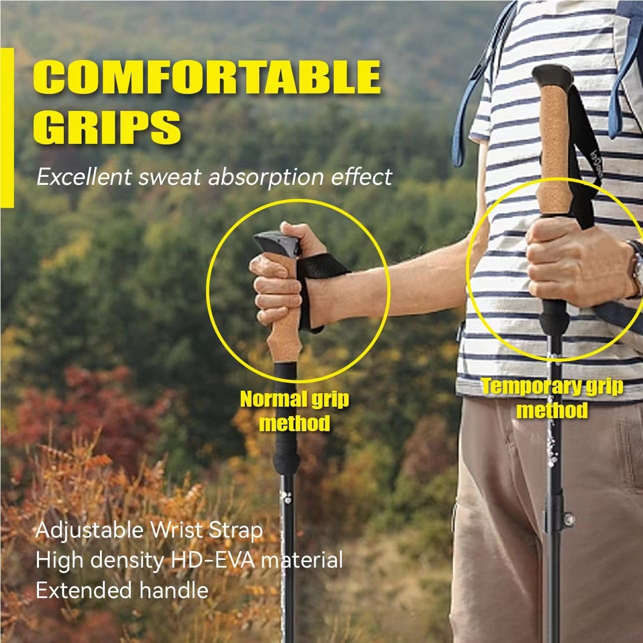 【trekking poles for hiking】The walking stick Crafted from aircraft-grade 7075 aluminum,Only weights 0.44lbs(0.2kg) per pole,lightweight but great for maintaining balance in difficult terrain such as during river crossings,on tree root-strewn trails, slippery bog bridges,countryside or backpacking trails.
