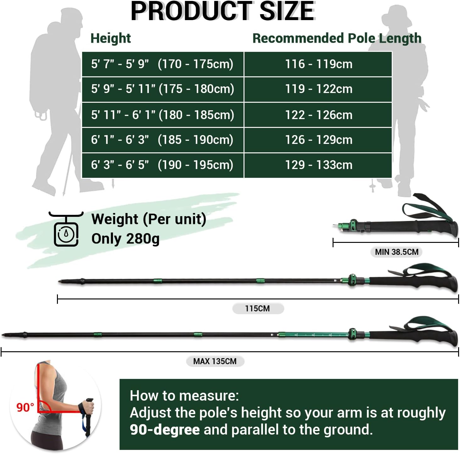 Size Guide: Short Pole 100-120cm (39.4-47.2″)for users 150-172cm(4’11”-5’7″), Collapsed: 36cm (14.2″). Long Pole 115-135cm (45.3-53.2″) for users 173-195cm (5’8″-6’4″), Collapsed: 15.2″ (38.5cm). Please verify size compatibility before ordering