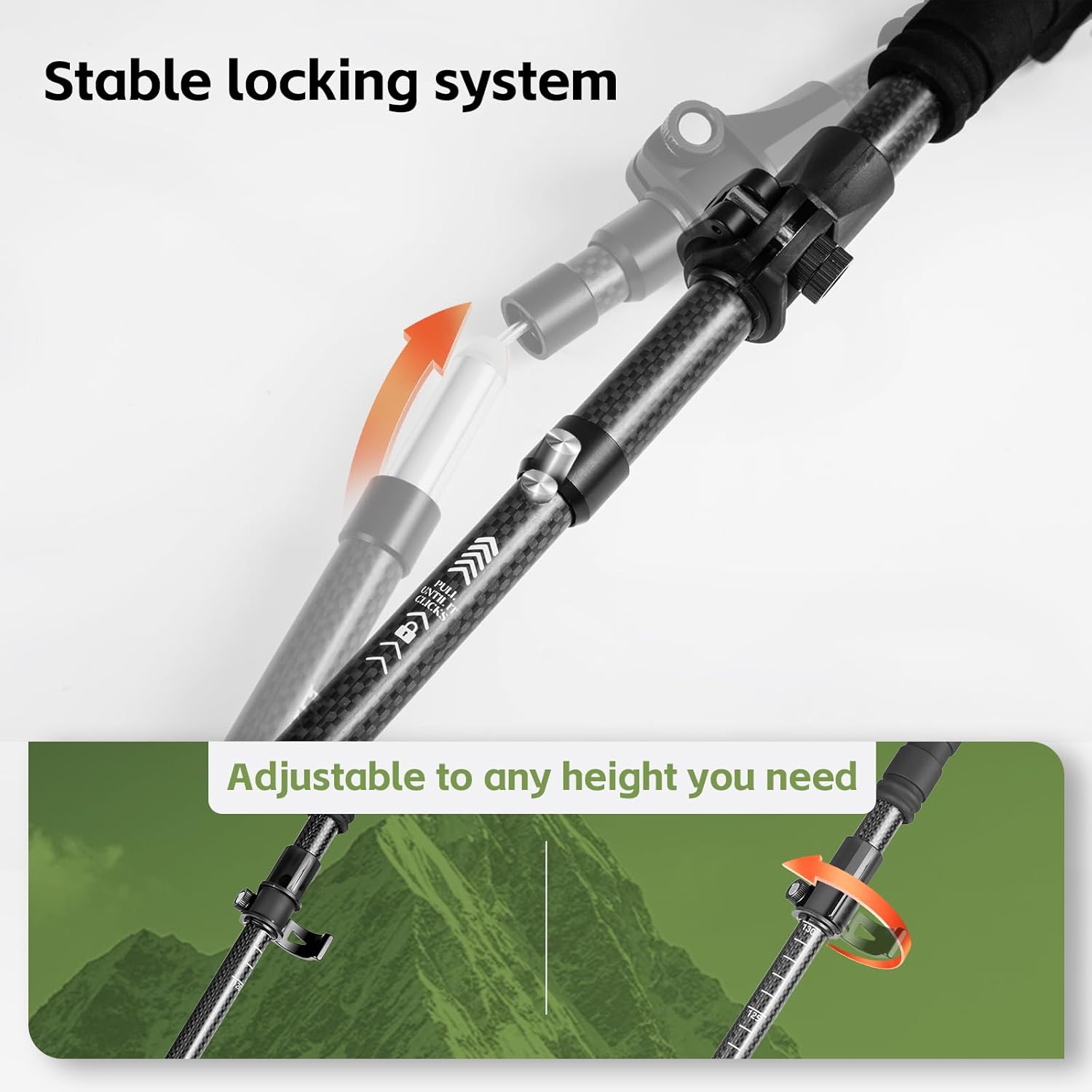 All-terrain and unisex: Folding trekking poles offer dual-size adjustment: 100-120 cm for individuals under 173 cm tall, 115-135 cm for those over 175 cm tall. These collapsible hiking poles easily adapt to any height. We also provide accessories for diverse terrains, allowing you to customize usage based on terrain requirements.