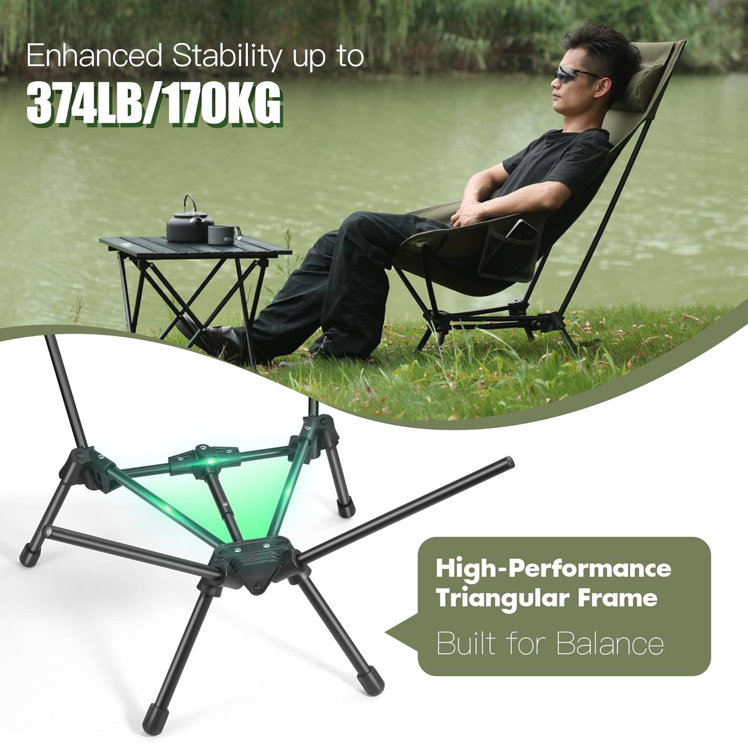 Sturdy Design for Reliable Outdoor Use – Supports up to 374 lb Built with a reinforced aluminum frame and wide, triangle-shaped legs, this chair offers enhanced stability on typical outdoor surfaces, giving you confidence wherever you set it down.
