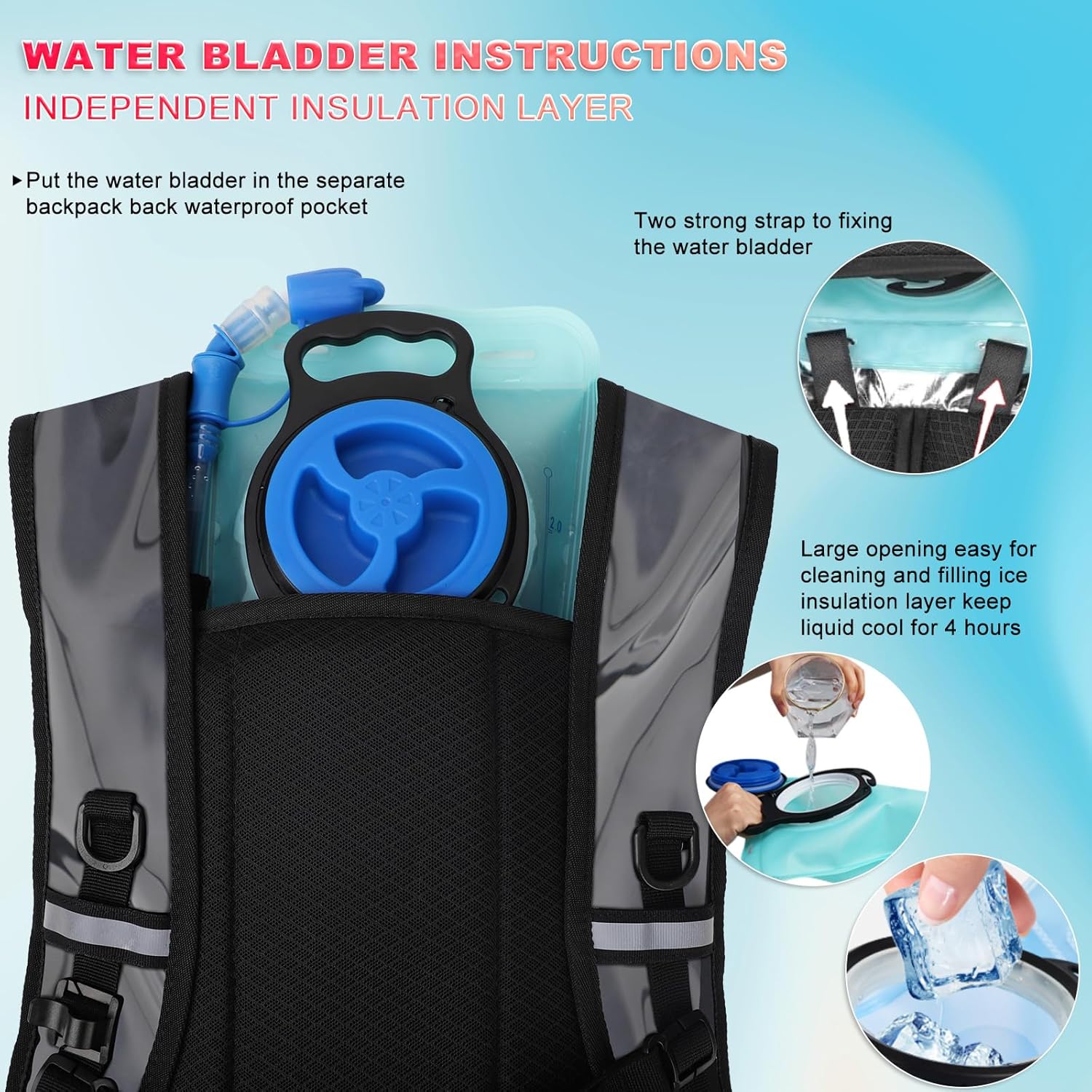 [2L HYDRATION BLADDER]:hiking backpack,water backpack,2L water bladder can provide prolonged drinking water requirements,eliminating frequent refills.Oversized 2-inch wide screw cap allows ice for an even cooler drink & makes cleaning easy.Quick release leak proof connector for easy set-up.Thanks to the insulated bladder compartment,keeps your fluids cool for up to 4 hours,ensuring you have free access to ice-cold water during raves,music festivals,running, hiking,biking and climbing