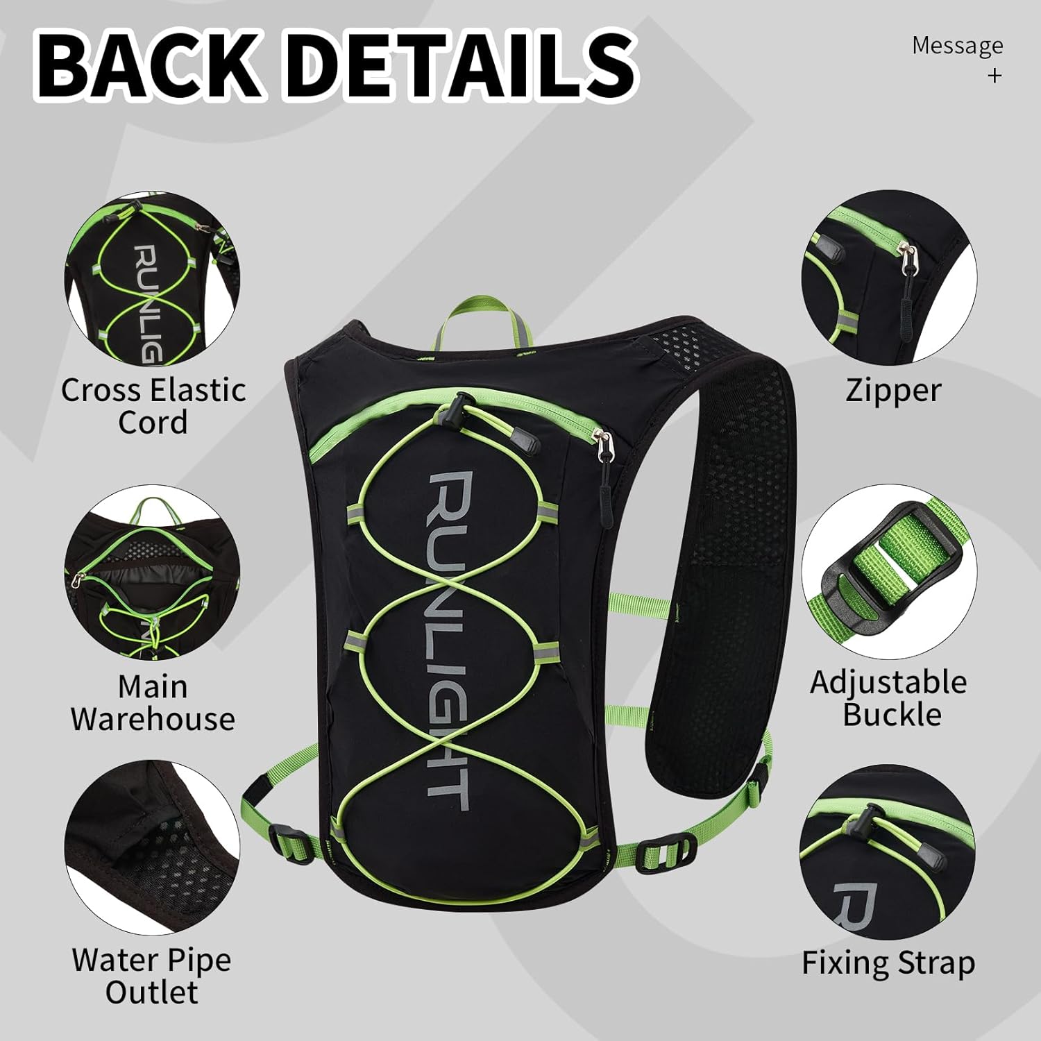 Runlight running vest hiking backpack kit aligns your back while gently protecting your muscles.The ventilated mesh cover keeps your back cool by maintaining air circulation,preventing discomfort due to accumulated heat,and providing excellent air circulation and breathability.