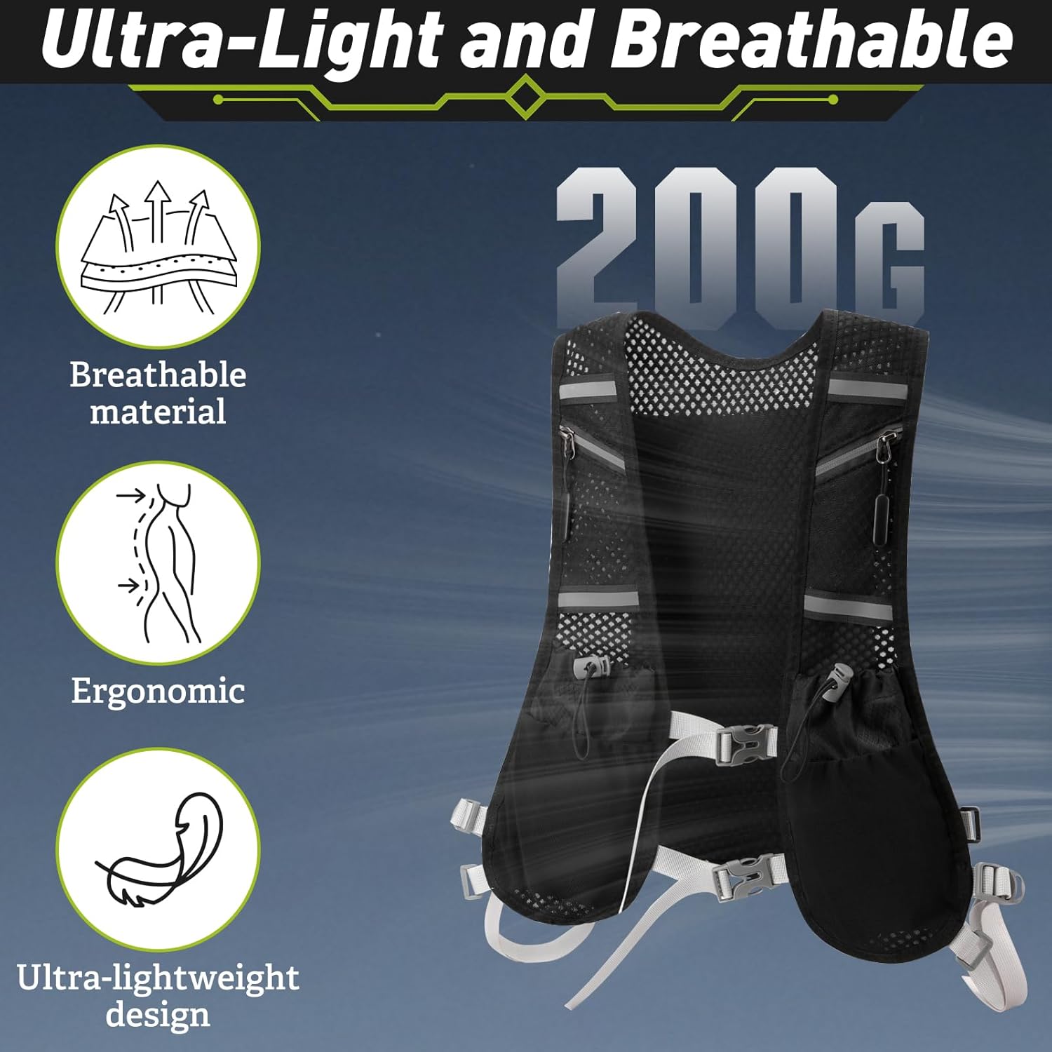 ✅【Ultra-Light & Breathable Comfort】Crafted from lightweight, moisture-wicking neoprene with ventilated honeycomb mesh, this running vest weighs only 234g (8.25 oz). The breathable design helps regulate your body temperature, keeping you dry and comfortable even on long-distance outings.