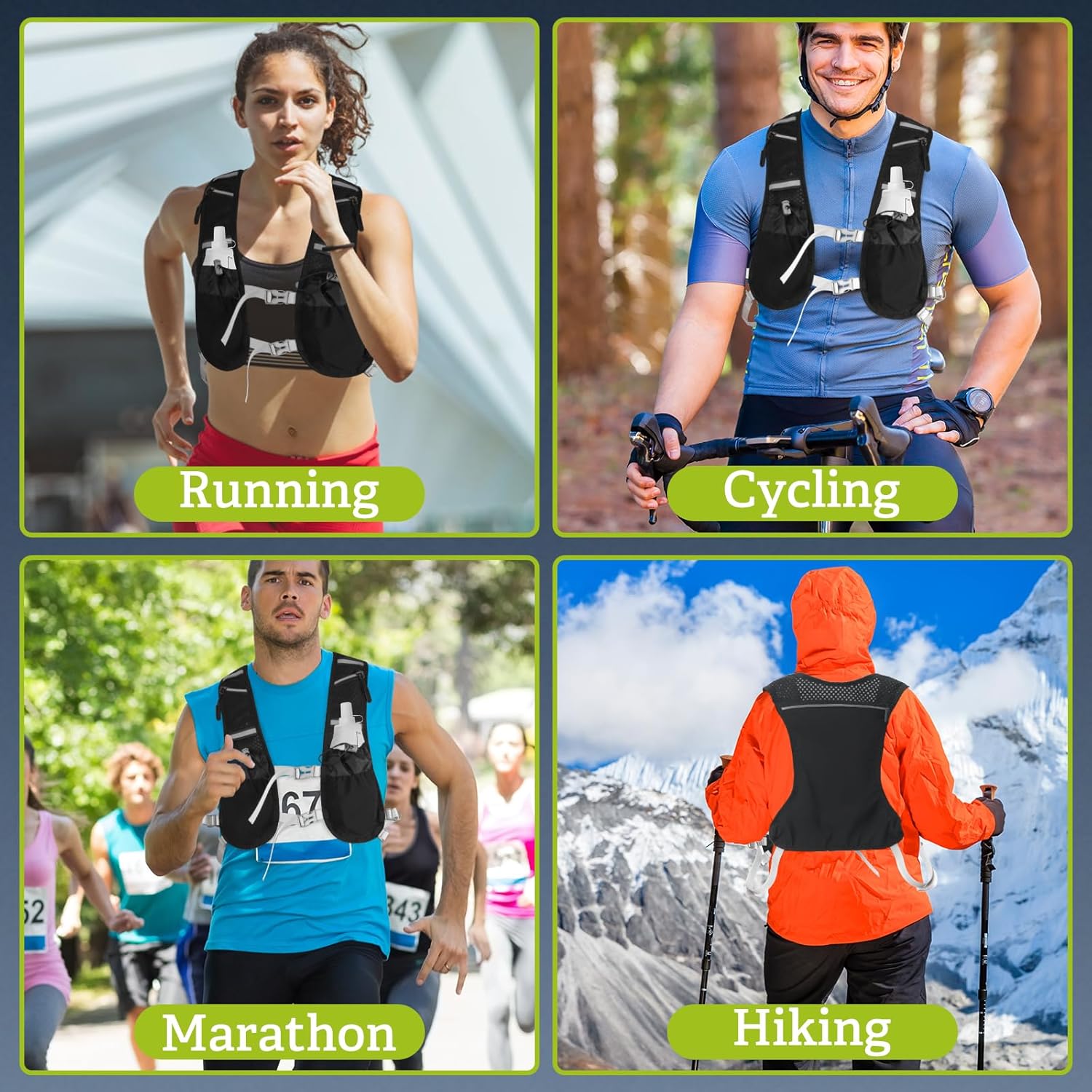 ✅【7 Pockets for Efficient Storage】Equipped with 6 front pockets and 1 large rear pocket, this hydration vest keeps your essentials within reach. Store energy gels, keys, ID, phone, and small towels securely. The hidden zippered phone pocket ensures bounce-free access, even during intense runs.