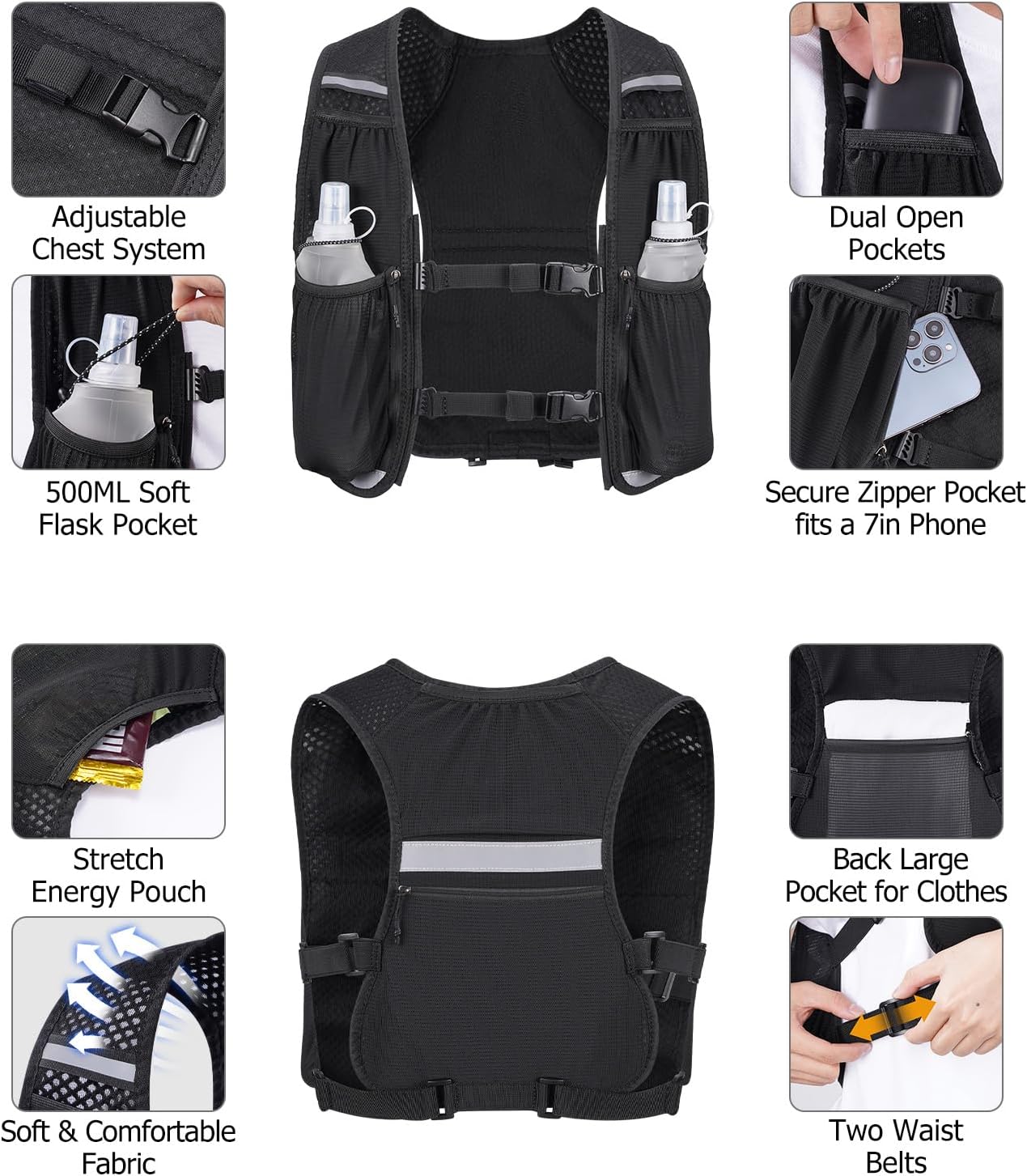 Dual 500ml Hydration Capacity – Features two 500ml soft-flask bottles made from safe, no BPA and no PVC TPU material. The foldable design ensures easy storage after use. Simply bite the valve to drink, making it ideal for marathons, long runs, and outdoor adventures.