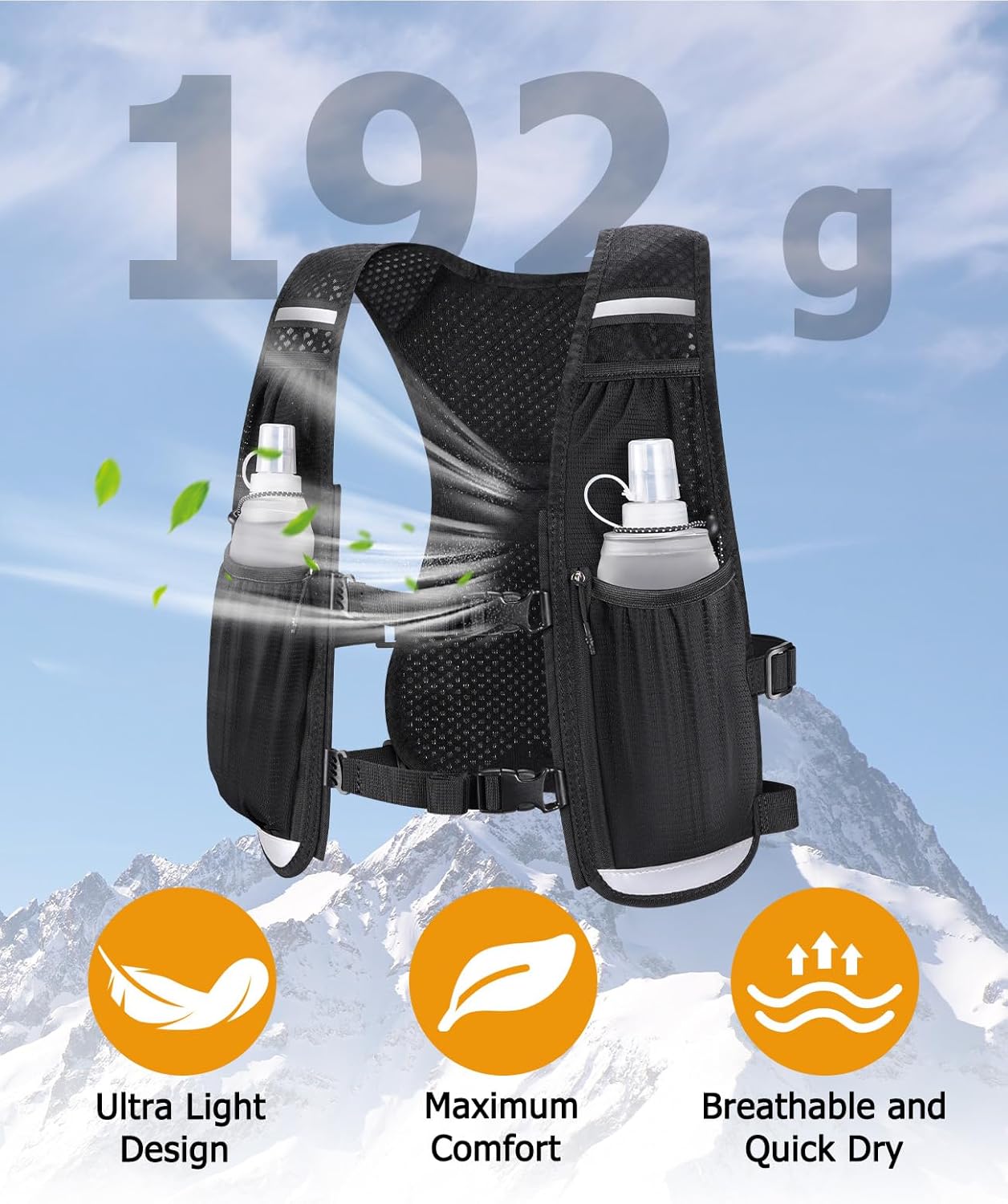 Lightweight & Unisex Fit – Weighing only about 192g, this hydration vest for women and men is built for performance without the bulk. Adjustable chest straps offer a secure and personalized fit for chest sizes 35″–47″ / 90cm-120cm. Great for running, cycling, trail training, and day hikes.