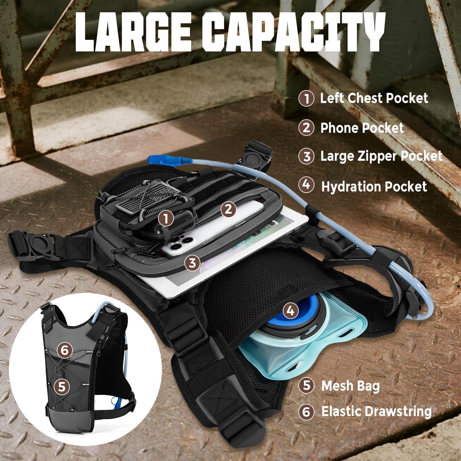 【Multi-Pocket Design】Along with water, Carry all your essential items in our Chest Bag. It comes with multiple pockets, designed to accommodate your gear and valuables conveniently and securely. Your phones, key, cash, snacks can be easily stored in the front pocket, and hydration bladder, towels, helmet can be placed in the backpack. Quick and Easy access to pick all your necessaries during running or cycling, get all your gadgets well organized in your front chest pack.