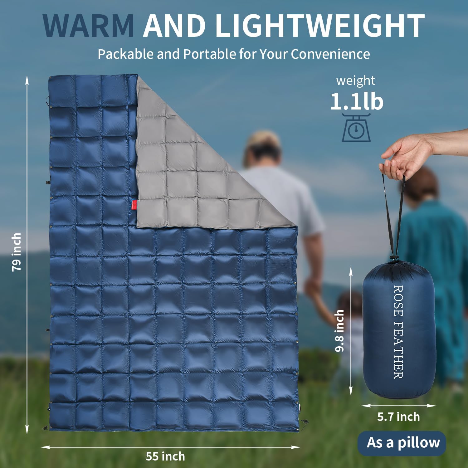 【Versatile All-Season Camping & Backpacking Blanket】Experience the ultimate 3-in-1 outdoor essential that functions as a warm down camping blanket, a cozy sleeping bag alternative, and a wearable poncho. Its lightweight and packable design makes it your go-to insulated camping blanket for hiking, beach outings, festivals, stadium events, and even as a comfortable travel blanket for airplanes and picnics