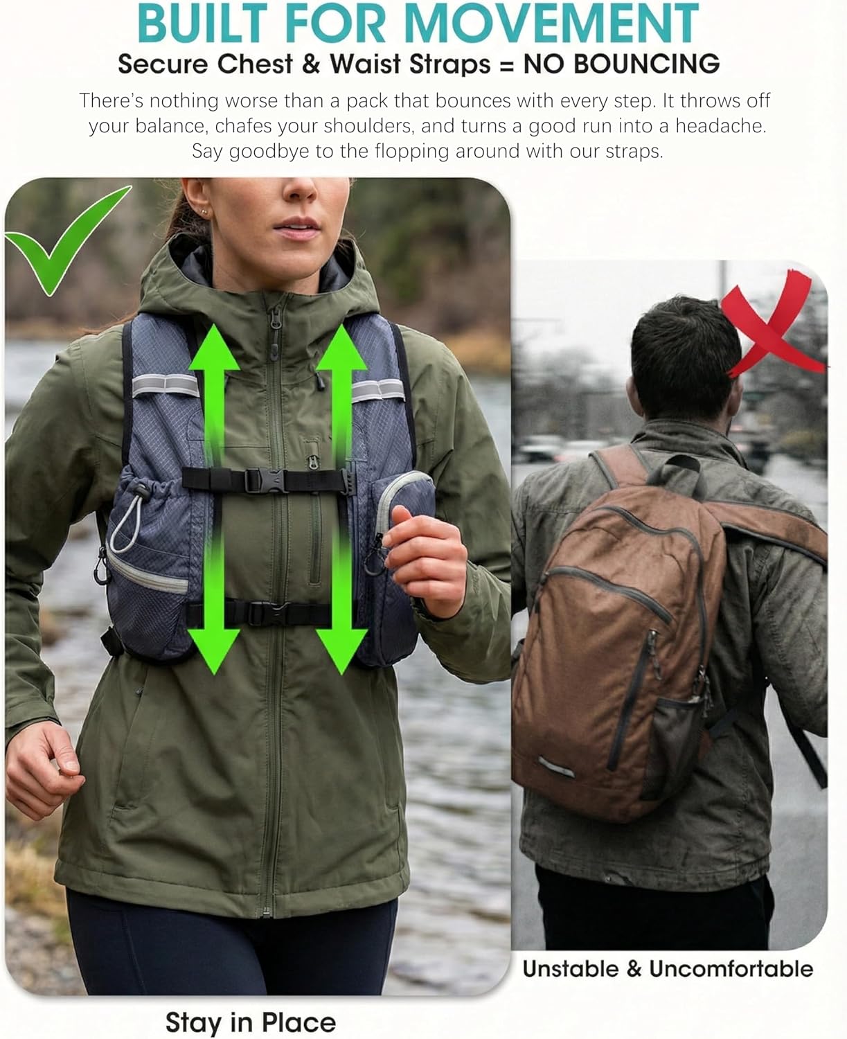 SECURE PHONE STORAGE & HYDRATION for your running backpack – Stop worrying about your phone falling out. Unlike open mesh pockets, our shoulder strap has a secure zipper pocket that locks in large 6.7″ phones safely while you run. The other strap features a drawstring pouch for your water flask. Grab your phone or a drink instantly without stopping—perfect for fast-paced theme park days with your small travel backpack and day pack