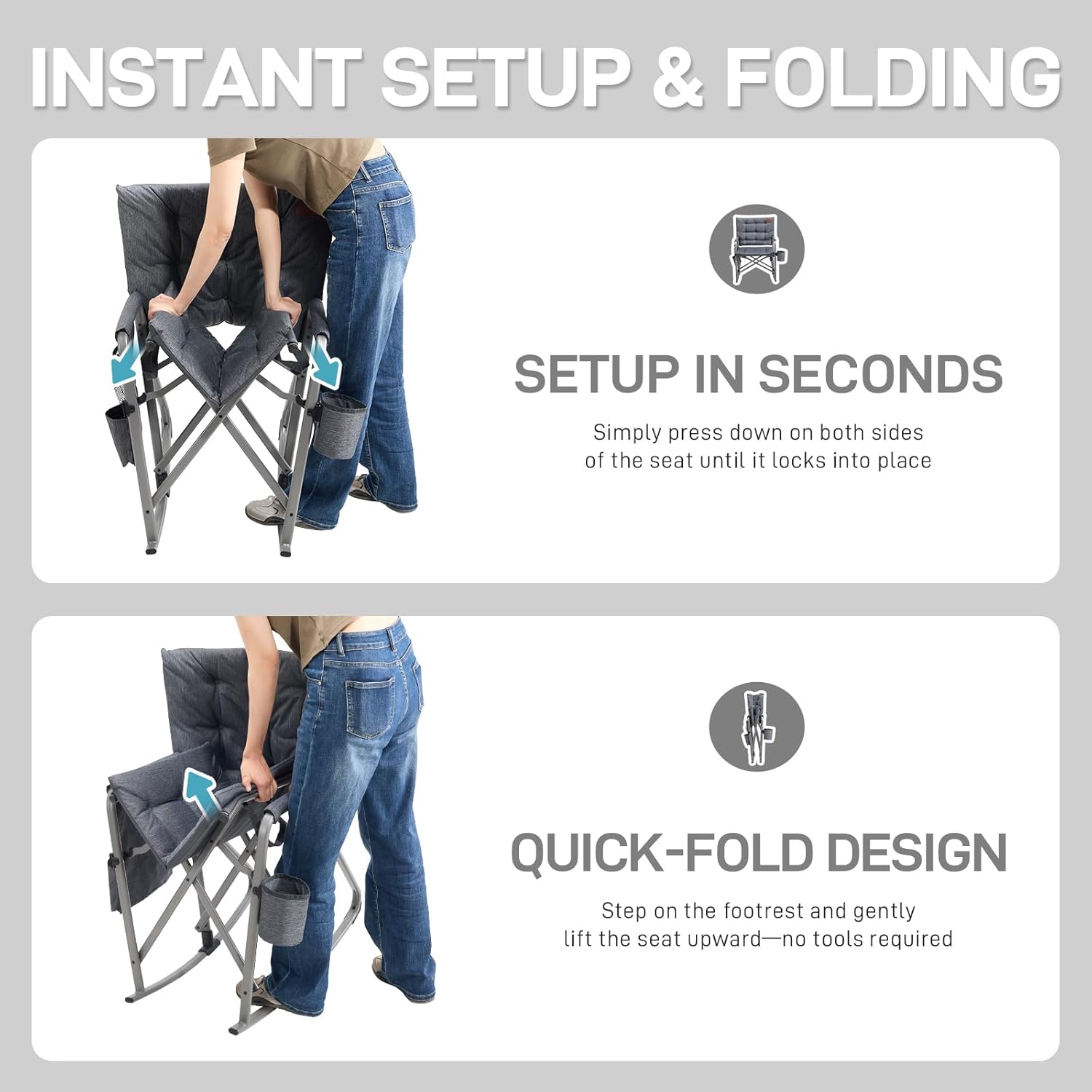 OVERSIZED DIMENSIONS: The portable rocking chair measures 26.8″L x 4.9″W x 36.1″H when folded and 27″D x 24.4″W x 36.1″H when open, with a seat height of 17.7″