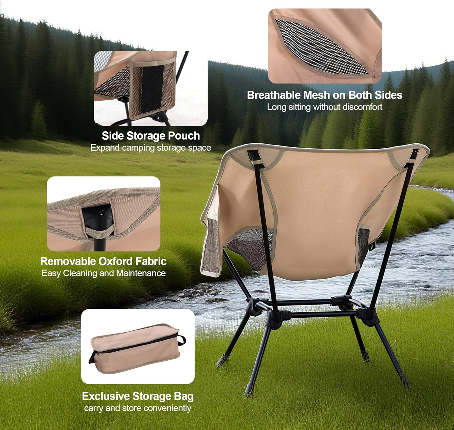 Practical Design: This ultralight backpacking chair comes with breathable mesh holes on both sides of the seat material to ensure proper air circulation and reduce discomfort. It also includes side storage pockets for keeping small items like phones and keys secure. The detachable 600D Oxford fabric material is easy to clean and air dry. Additionally, the exclusive handle storage bag makes it convenient to carry when on the go.