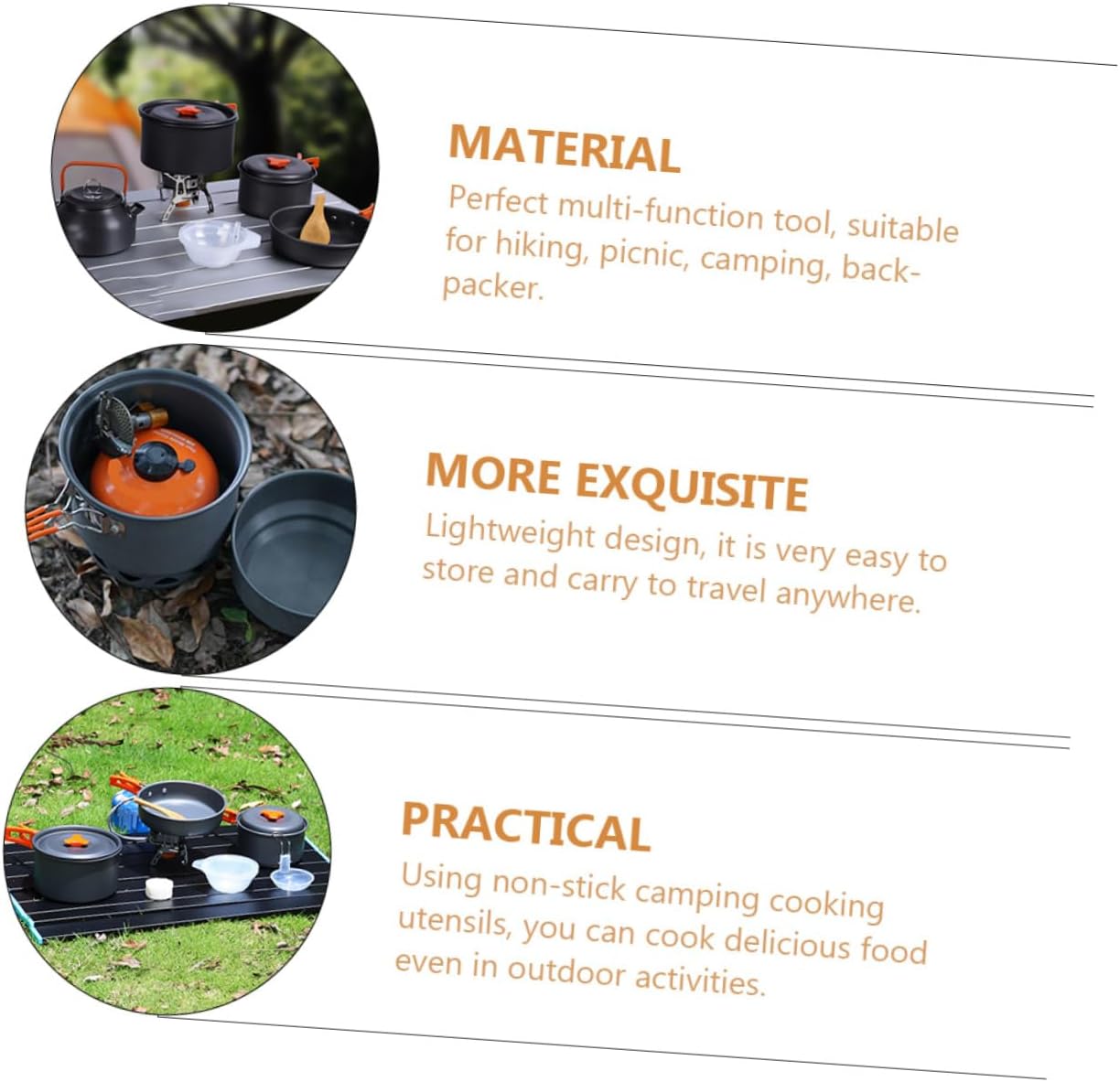 – The cookware forms simple and convenient save space and facilitate carrying out Camping Cooking Tool.