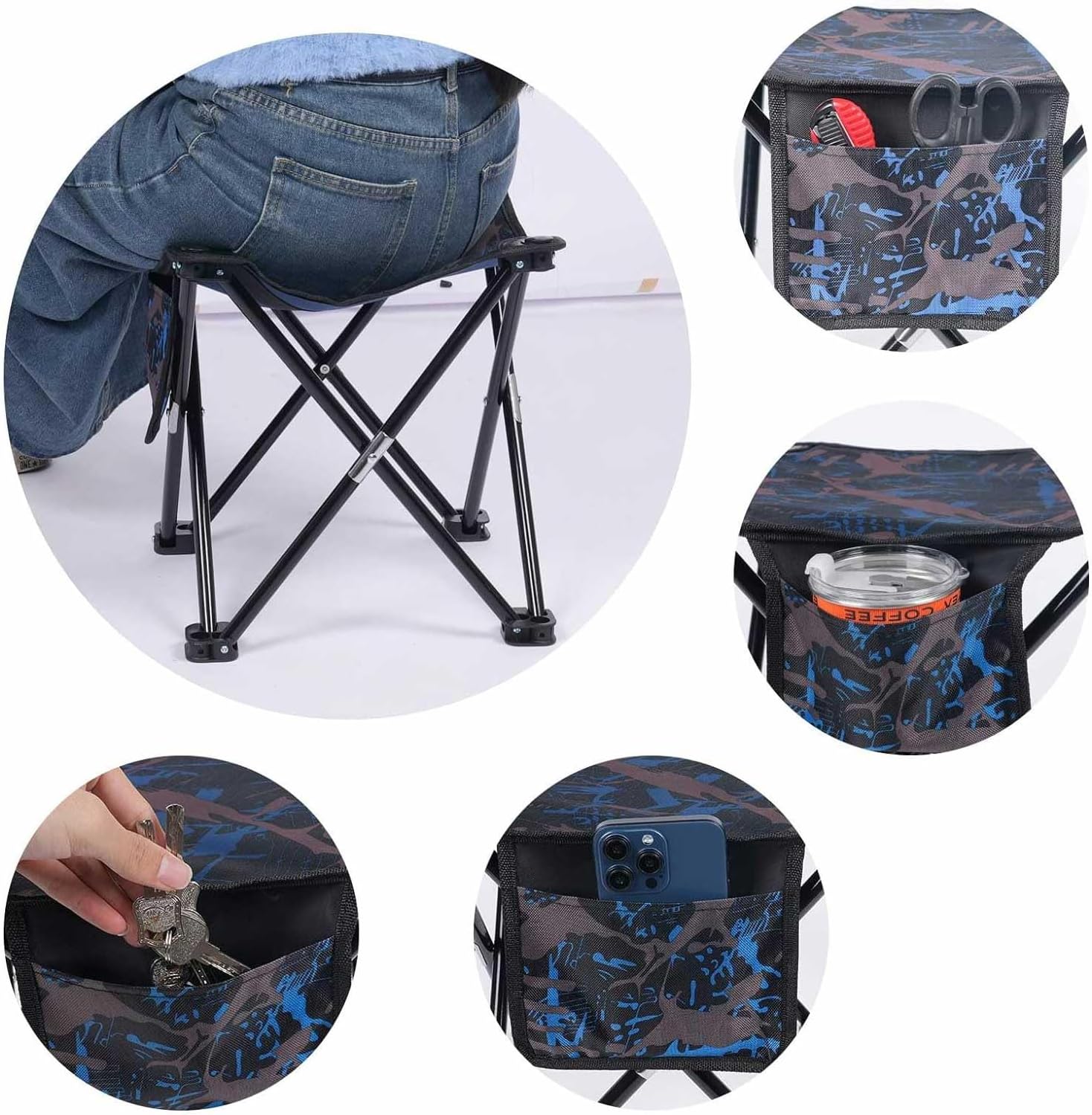 STURDY AND DURABLE: This mini portable seat is made of a high-quality steel frame and 600D polyester fabric, The steel frame is ultra-light and the four-legged design can provide better support. Strong and durable, the 600D seat is soft and comfortable. Even if you sit on a camp stool for a long time, you will not feel tired.
