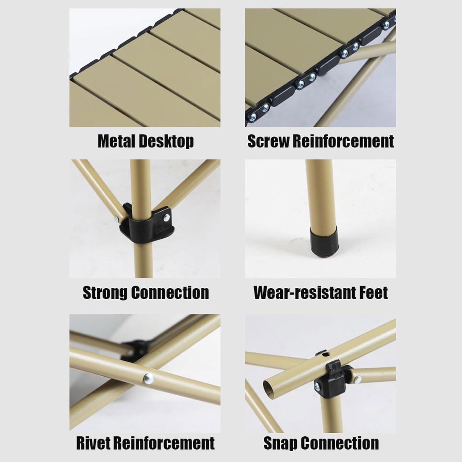 【Sturdy and Reliable】Compact camping table is crafted with reinforced carbon steel, with thickened and enlarged foot caps,ensuring unwavering sturdiness and durability.The non-slip matte finish of the portable rolltop table keeps your cups and items securely in place.