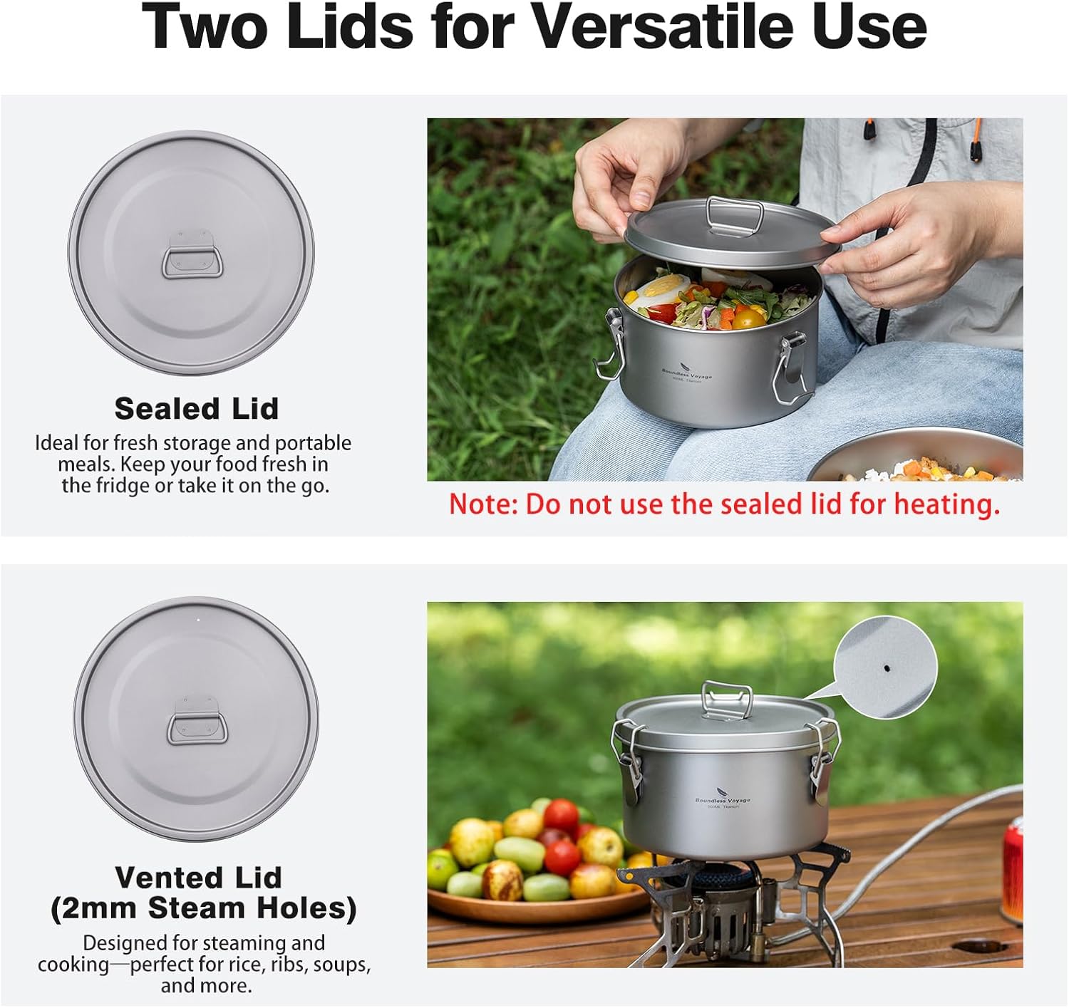 Two Lids for Versatile Use: 1. Sealed Lid: Ideal for fresh storage and portable meals. Keep your food fresh in the fridge or take it on the go. (Note: Do not use the sealed lid for heating.) 2.Vented Lid (2mm Steam Holes): Designed for steaming and cooking—perfect for rice, ribs, soups and more. The precision steam vents ensure even heat distribution for a superior cooking