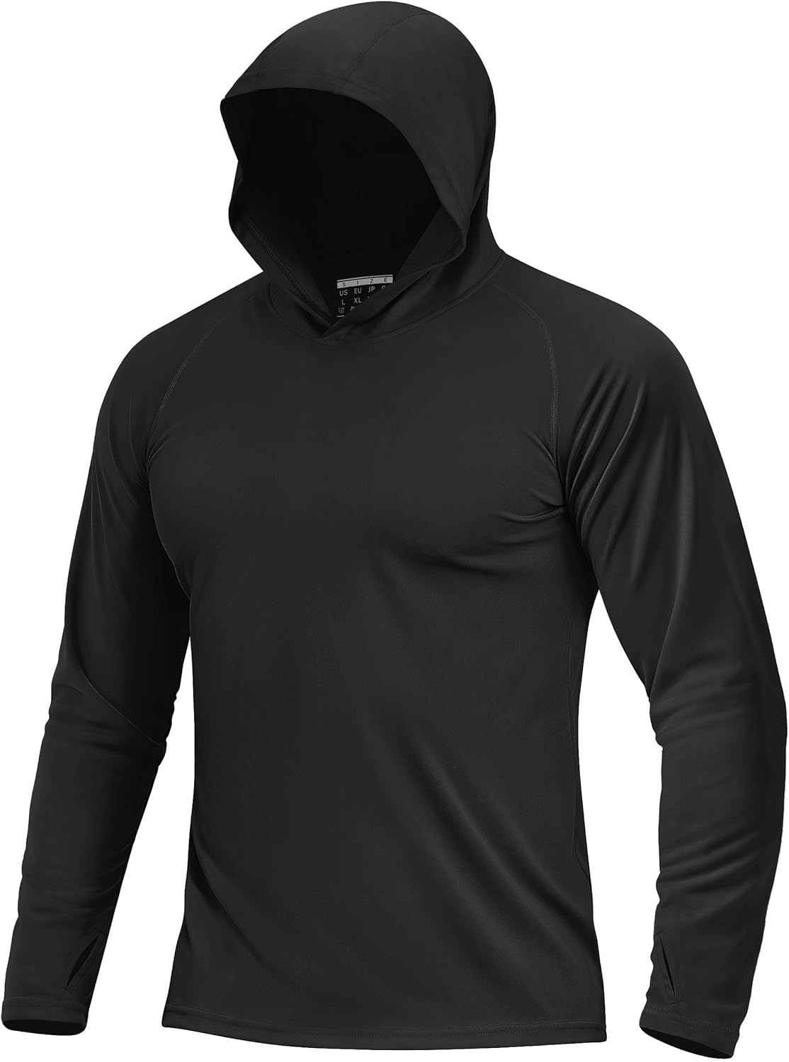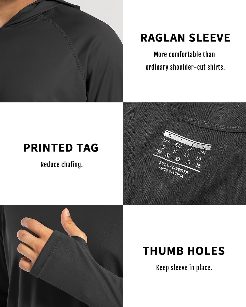 Features: Long sleeve with thumb holes, with hood, printed tag, raglan sleeves.