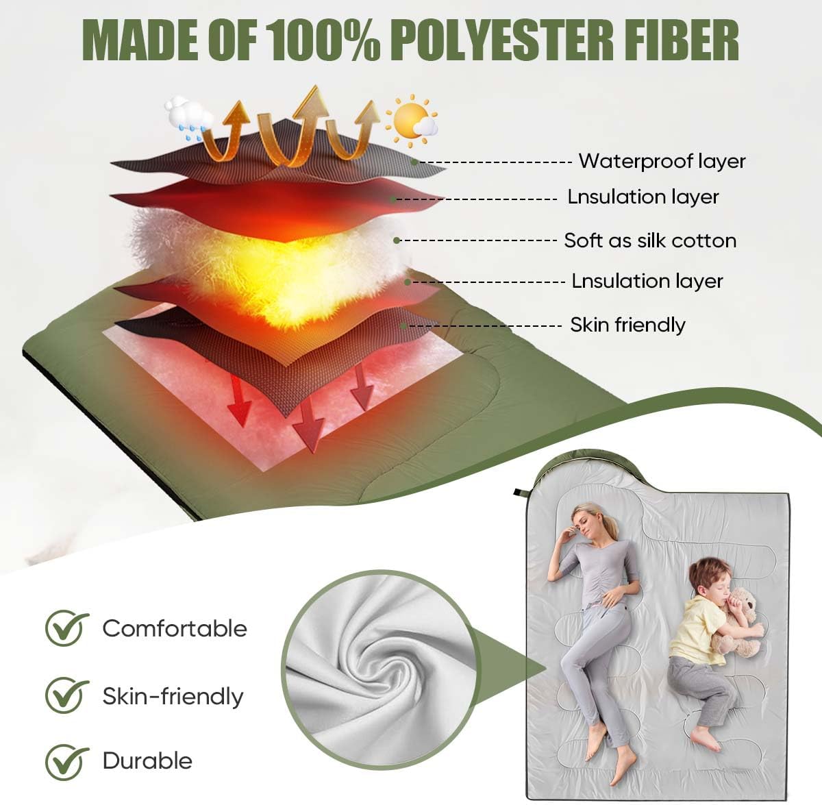 Material: Our sleeping bag is made of polyester and filled to keep the inside of the sleeping bag warm all the time. The inner fabric is filled with double microfiber, which is very soft.