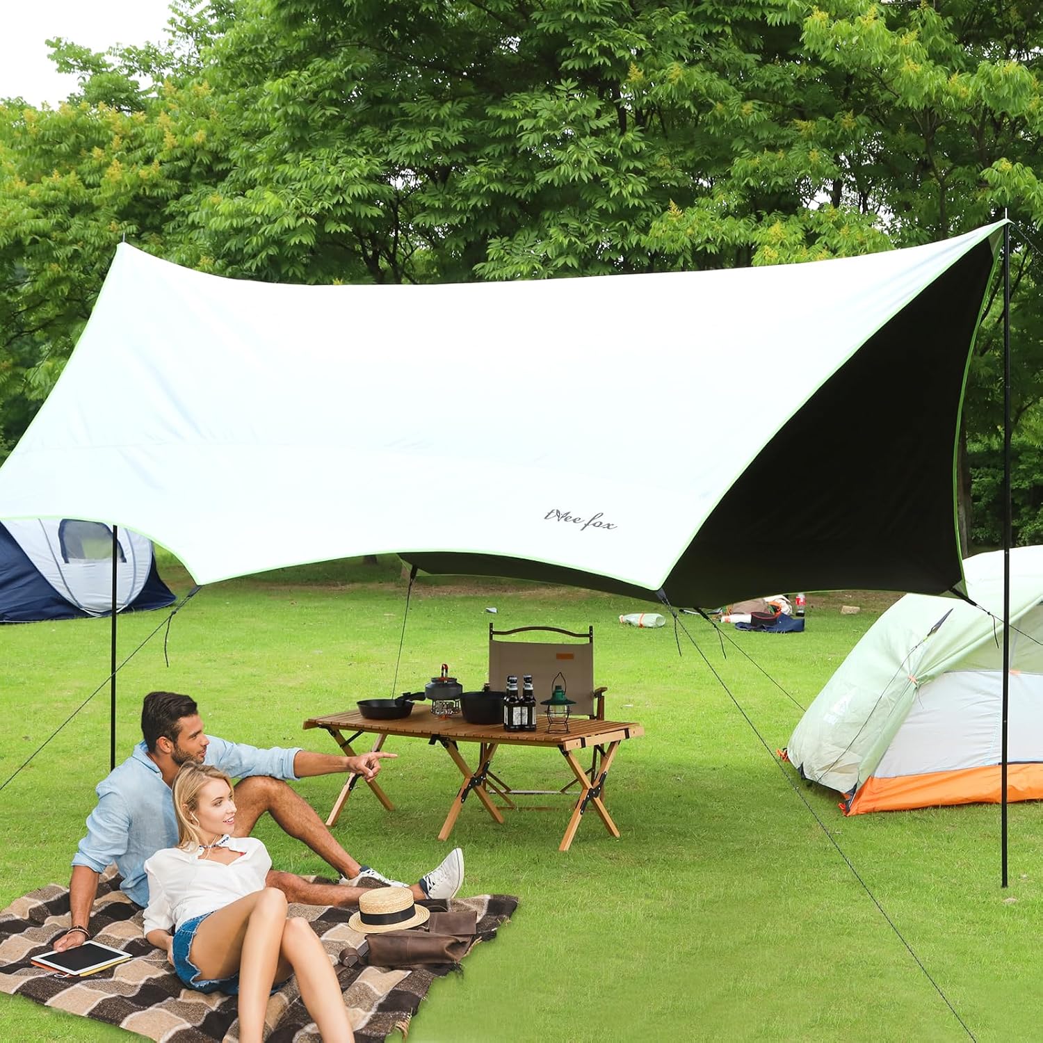 RAIN AND UV RESISTANCE: The tent tarp is made of 210D Oxford fabric with light and rain blocking technology, waterproof 18000mm+, UPF2000+; the tarp can block 99.99% of harmful UV rays, providing spacious sun-shading area and cool and comfortable resting space; when encountered with torrential rainfall, the tent tarp can be used as a rain tarp or an emergency shelter to prevent from getting wet.