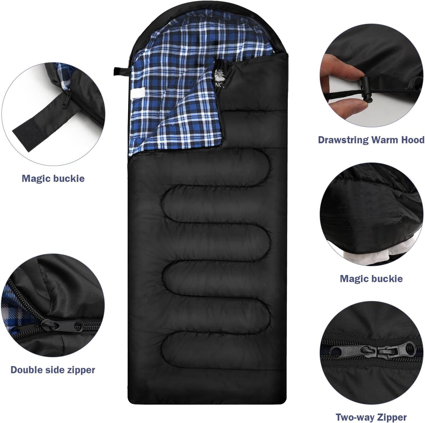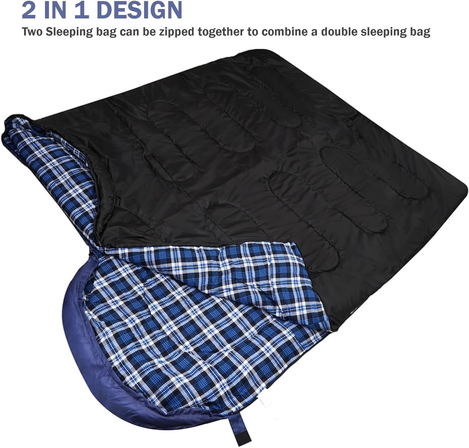 COZY: 100% super soft brushed cotton flannel lining,and filled with a high level 3D synthetic fiber fill,Features fastening-straps for keeping zippers safely closed,and unzips at the top or bottom for easy access and ventilation,perfect for camping in 3 seasons.