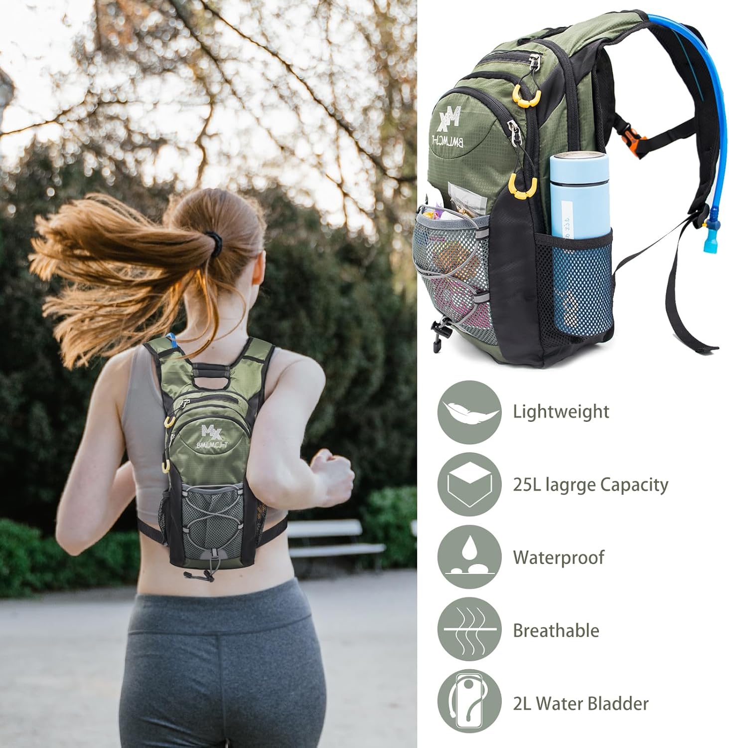 LIGHTWEIGHT & PLENTY OF SPACE: The waterproof Hiking hydration pack backpack with 25L of storage capacity, 3 large and 1 small zippered pockets, and front and side netting pockets ensure that storage space for essentials is well-distributed, , to hold your phone, keys, a snack and headphones making it easy to access items such as granola bars.