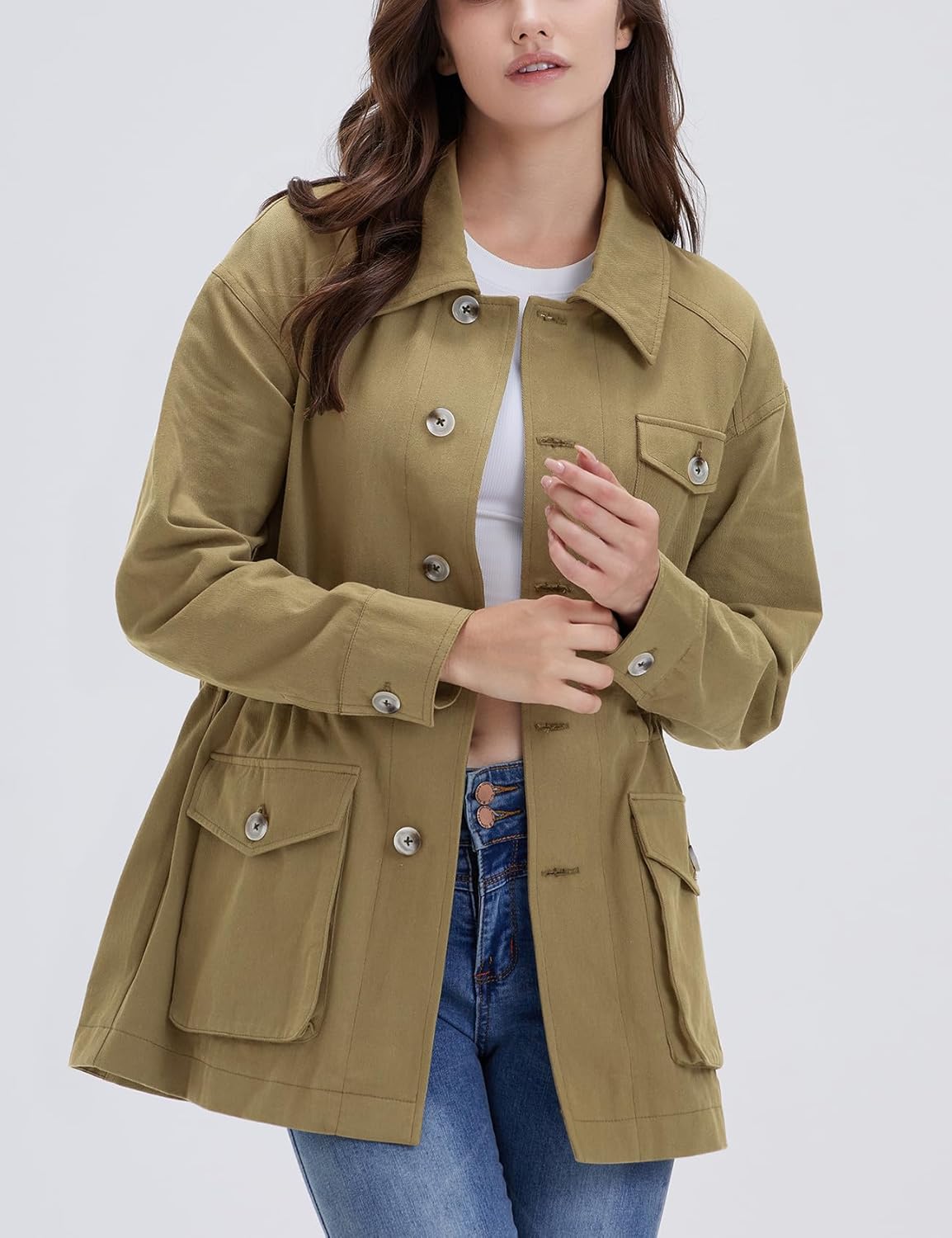 SHOW OFF YOUR CURVES – You deserve a utility canvas outerwear that fits you perfectly. This WenVen women’s cargo jacket features its slim fit silhouette with an inside waist drawstring that provides a flattering, feminine look.HANDY POCKETS – Each safari anorak jacket is completed with multi pockets for carrying your phones, passports, and lipsticks – a classic design that also makes it versatile and plenty wearable.CASUAL COMFORT DESIGN – The breathable and durable cotton fabric adds a touch of warmth to chilly summer nights, while the roomy design allows you to wear a sweater or sweatshirt underneath it during the colder months.PAIR IT WITH ANY OUTFIT – Team this lightweight army jacket with your favorite blue jeans or pants for a casual but stylish combo! You can also choose to detach or attach the hood for different styles.EVERYDAY FASHION WEAR – This button up stand collar anorak combines leisure and contemporary military style. It is perfect when running errands, walking the dog, and even taking a short hike after work – you’ll love it to be your wardrobe staple from fall to winter.