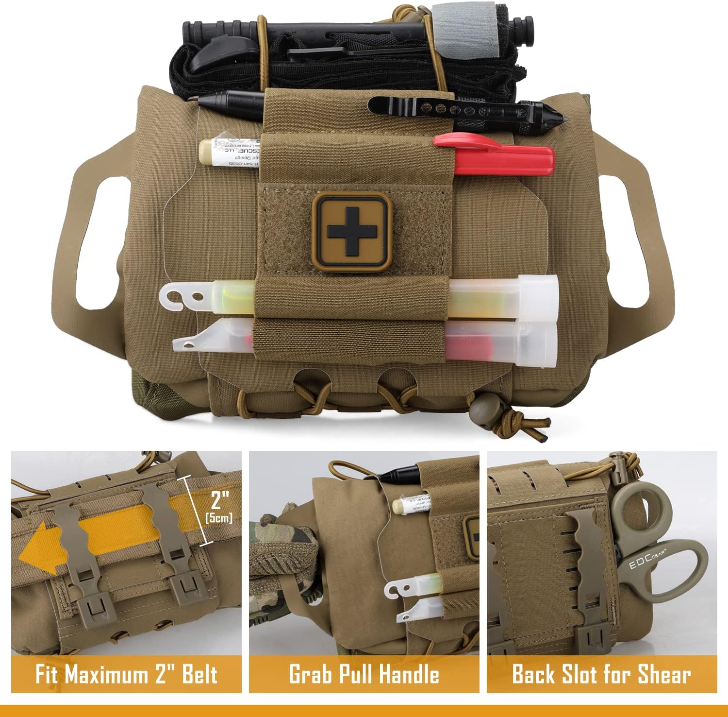 FRONT LOOP FOR MEDICAL CROSS PATCH: Molle medical pouch features Loop Panels on the outer roll and insert for label patches(Medical Cross Patch included). Help quickly identify your first aid kit. Ideal for scenarios such as camping, hunting, hiking, car accident, field trips, home, office, and car, and also for tactical activities, and team activities.