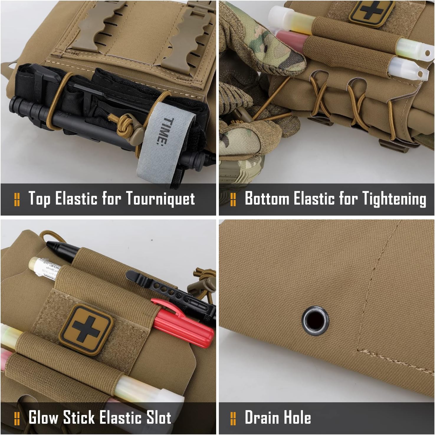 2-IN-1 QUICK DEPLOY DESIGN: IFAK Pouch is divided into a medical roll bag and an insert carrier. Outer roll has 4 elastic loops for glow stick/chem light/markers and some shock cord for a tourniquet. Insert consists of two elastic loops to keep medical essentials secure but visible. Two large compartments towards the bottom also can fit Quikclot bandages, chest seals, or other flatter IFAK supplies.