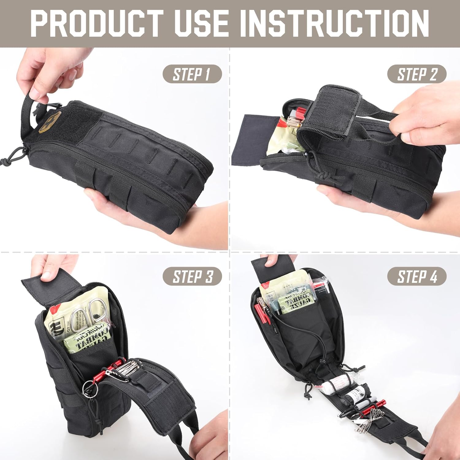 COMES WITH 4PCS MOLLE CLIPS: Emergency Bag comes with 4pcs MOLLE clips, two long clips for vertical installation on PALS or any large MOLLE surface, expending space. First Aid Pouch with another two short clips for horizontally attaching to the waist belt, and have at fingertips when needed quickly.