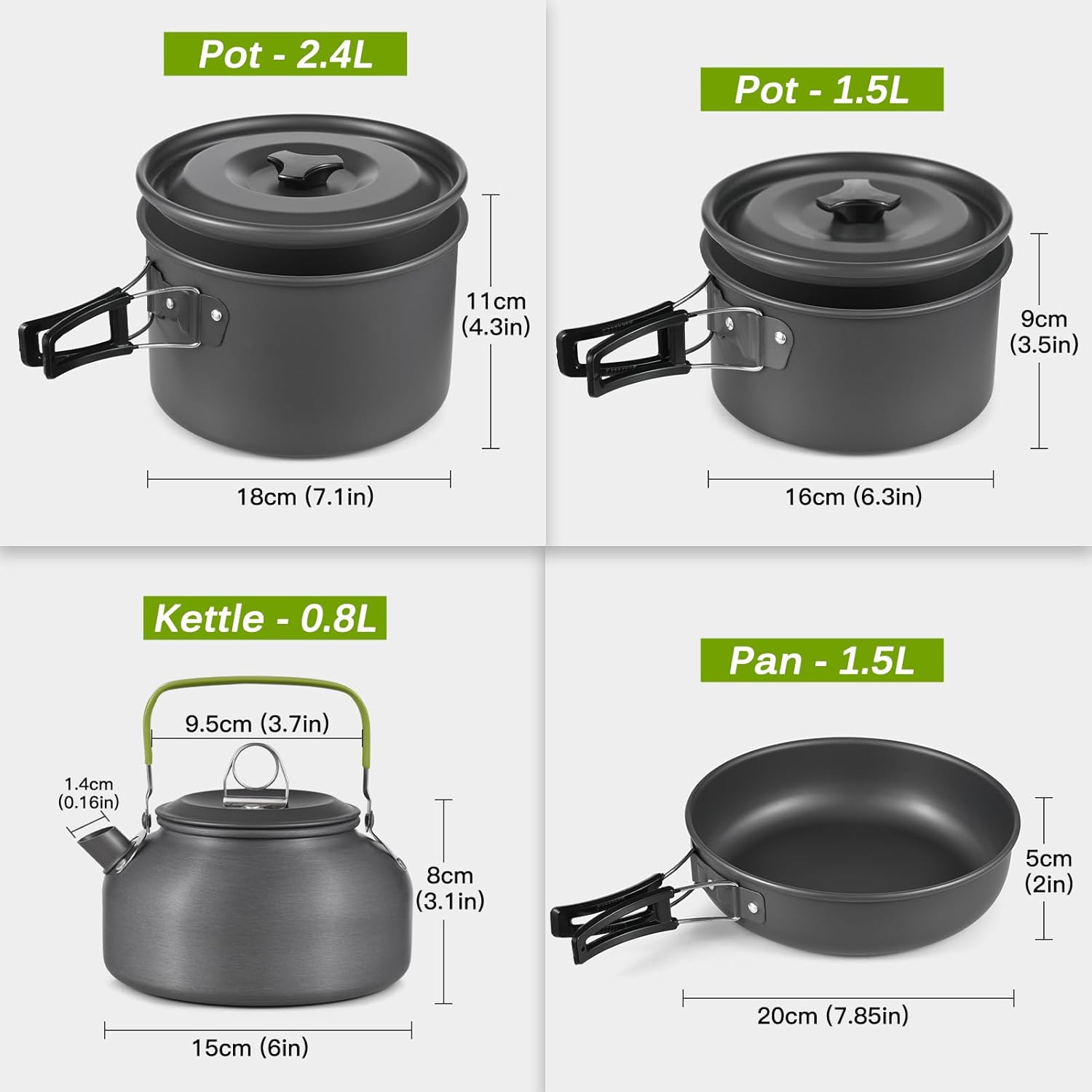 【HIGH QUALITY COOKWARE MESS KIT 】 All pots and frying pans are made of high-grade hard aluminum oxide, which is resistant to high temperature and wear, and is very suitable for outdoor cooking.Coated with a non-stick for easier use and clean up. The dinner cutleries are made from 304 stainless steel which is completely safe to use.The cleaning cloth is safe to use on the coated surface and allows you fast and easy clean-up after you’re done.