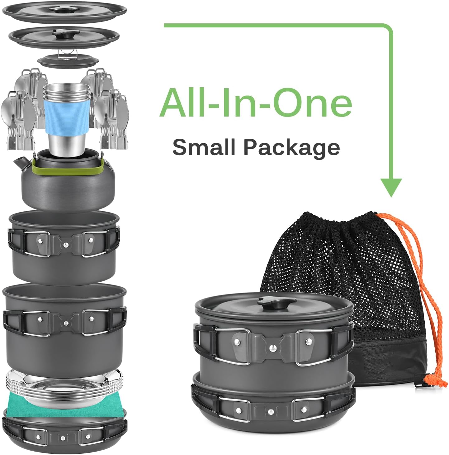 【EASY TO CARRY】All pots and frying pans in this cooking set are designed with foldable handles for easy storage. All the forks knives spoons are foldable and can be easily packed into the cloth bags for simple storages. All the camping kit can be stored in one small package and putted in the mesh bag for easy carrying.