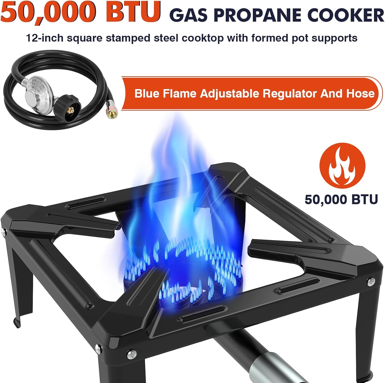 COMPLETE ALL-IN-ONE KIT – READY IN MINUTES: No extra trips to the hardware store! This Propane Burner comes with everything you need, including a 4.1-foot high-pressure hose for standard 20lb tanks. Designed for a hassle-free experience: simply unbox, follow the easy setup steps to assemble, and hook up the regulator for instant outdoor culinary fun.