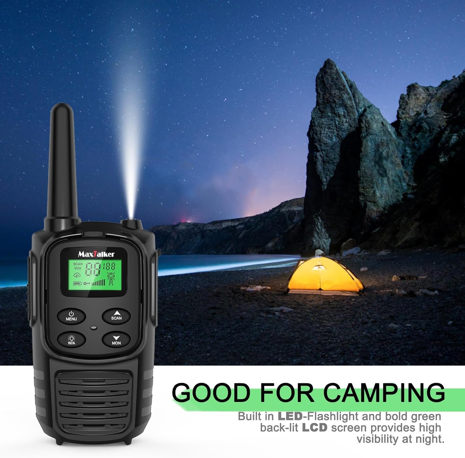 Walkie Talkies Long Range: MaxTalker MT10 FRS walkie talkies offer an impressive communication range of up to 5 miles in open areas, ensuring you can stay connected with friends and family during outdoor adventures, camping trips, or hiking excursions