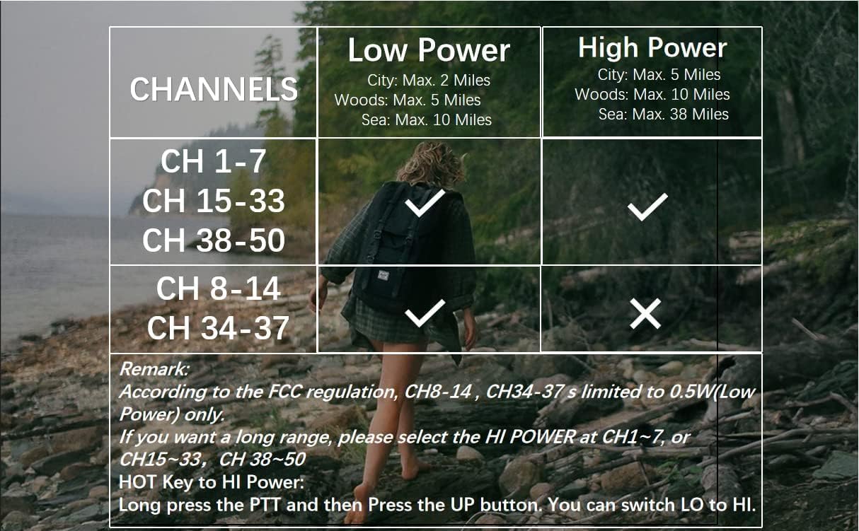 FCC Compliant: Adhering to FCC regulations, please note that channels 8-14 and 34-37 are limited to 0.5W in low-power mode