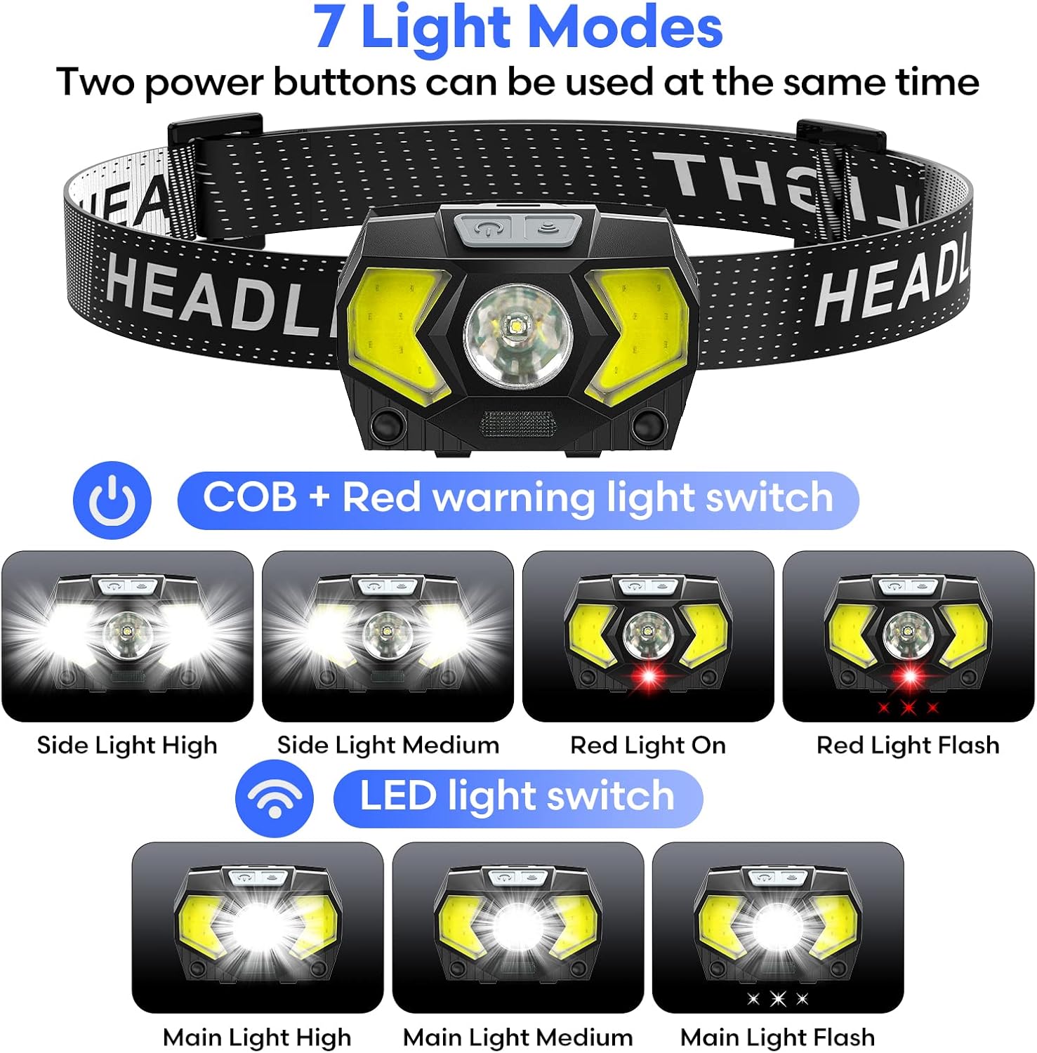 7 Modes: This headlamp battery powered has 2 power buttons for 7 different light modes.Power Button ①: Side Light High;Side Light Medium;Red Light On;Red Light Flash.Power Button ②:Main Light High;Main Light Medium;Main Light Flash.