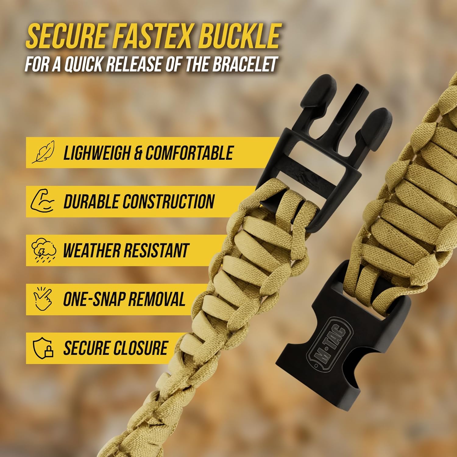 The M-Tac Paracord Bracelet comes in sizes M and L, with a length of 9 – 9.8 inches to fit most wrist sizes comfortably.