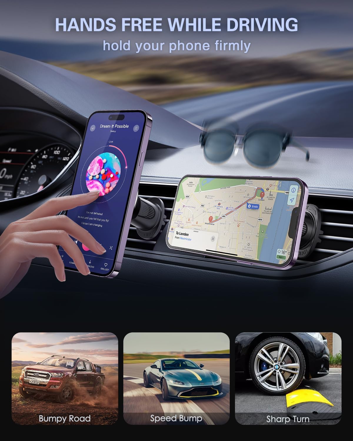 [Universal Compatibility] : This industrial magnetic attraction phone mount for car is accommodating various phone sizes and models, whether iPhone 16 /15 /14 /13 /12 series, android, official magnetic case or normal phone case. And small extendable steel hook clip compatible with most horizontal & vertical car airvent ac outlet, perfect fit your driving needs, women girly can enjoy the convenience of a reliable versatile bracket. ( Note: Provide two 3M magnet metal rings )