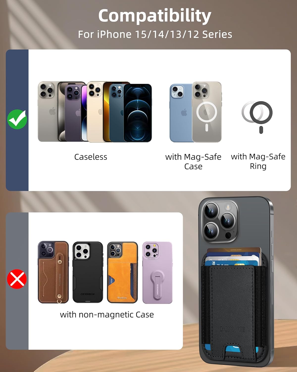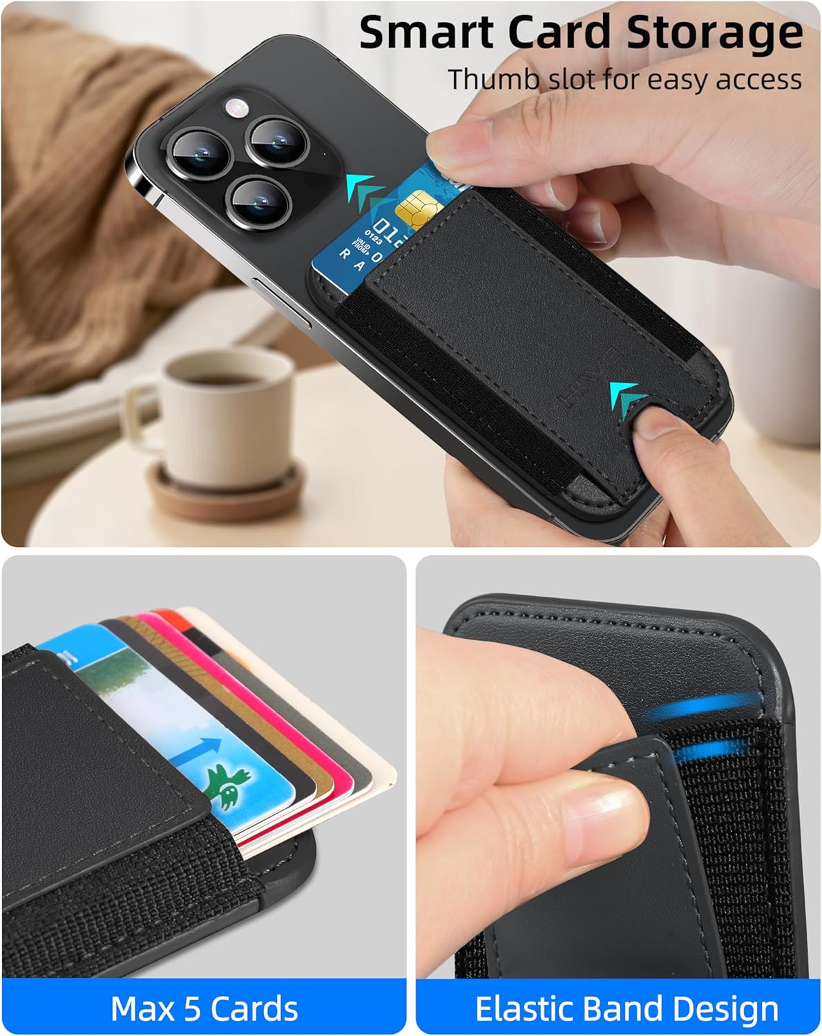 Stay Secure: 3X Stronger N52+ Magnet vs. Apple’s official wallet, HiWe’s 4200g magnetic force grips tighter than the official original; Stretchy elastic bands prevent card slips even when upside down