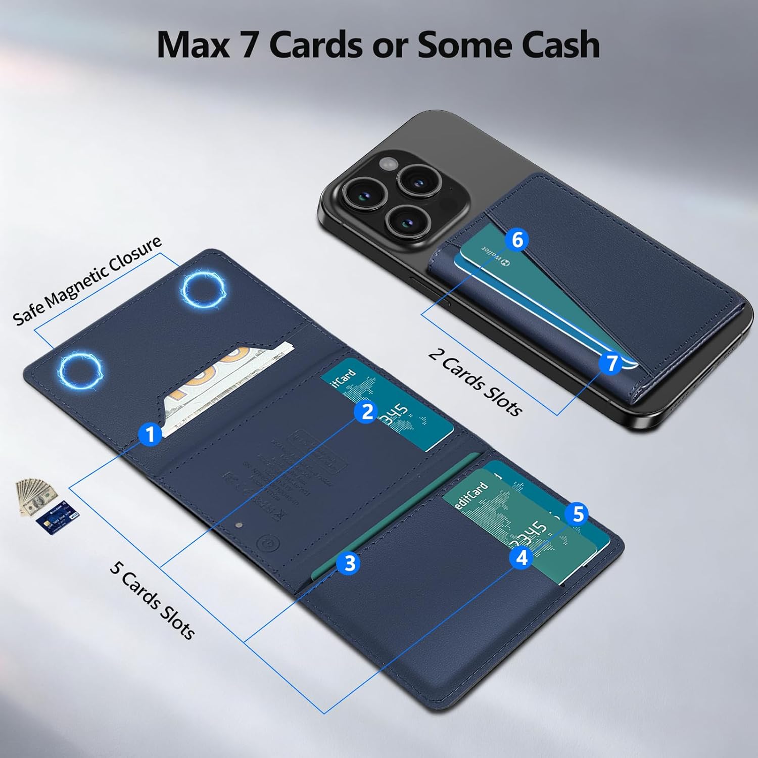 【7 Cards Holder】: Smart magnetic card wallet finder for iphone has 7 slots to hold Max 7 cards. You can also fold the cash and stuff it into the cash slots inside. Large storage capacity can hold your ID card, credit card, license, debit card etc.