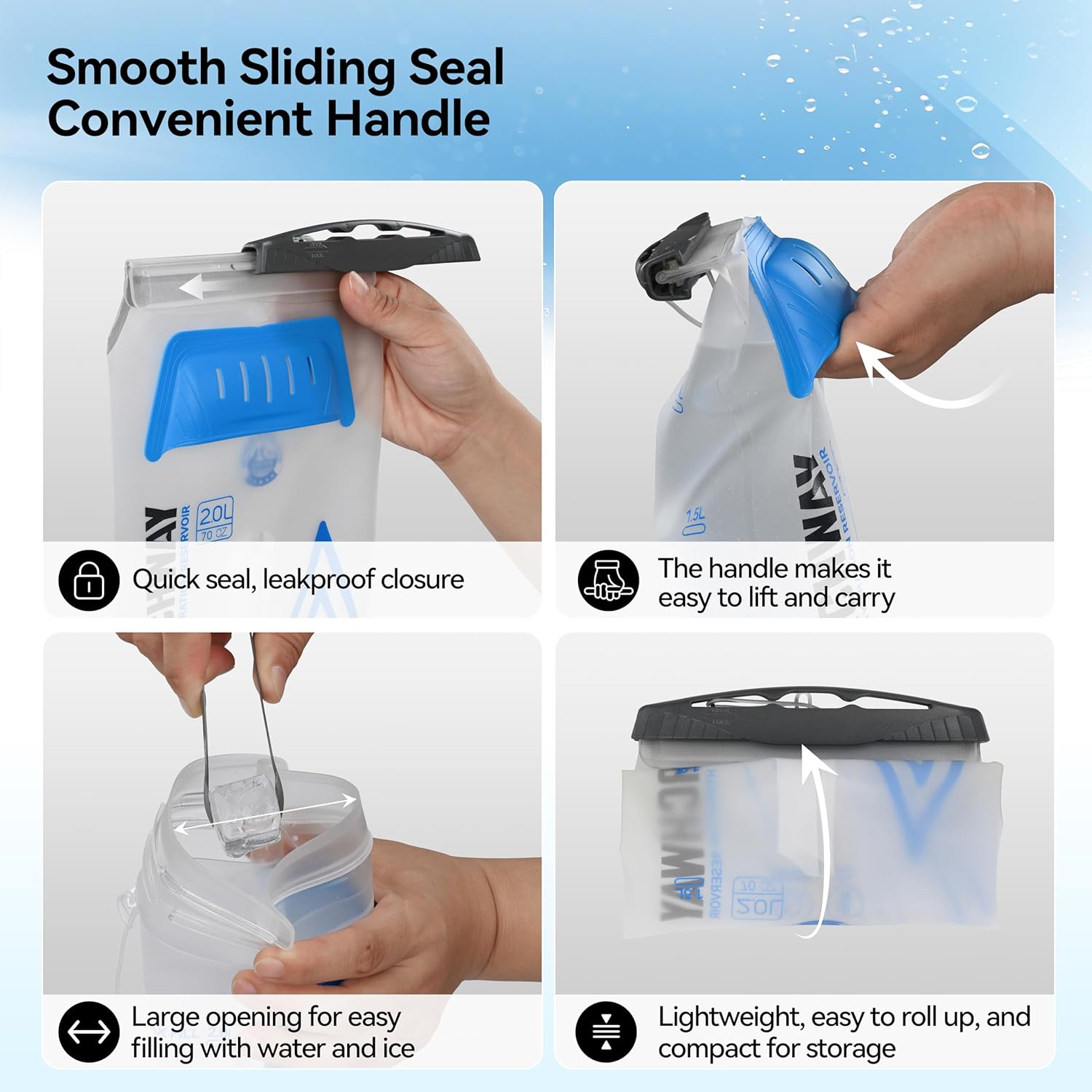 Lightweight & Portable: Featuring a slide-seal closure, this hydration reservoir is lightweight, easy to roll up and compact for storage. The well-designed seal offers leak-proof reliability with smooth operation. An integrally welded carry handle provides added convenience for transport. Compatible with most backpacks, it allows you to hydrate freely on the go.