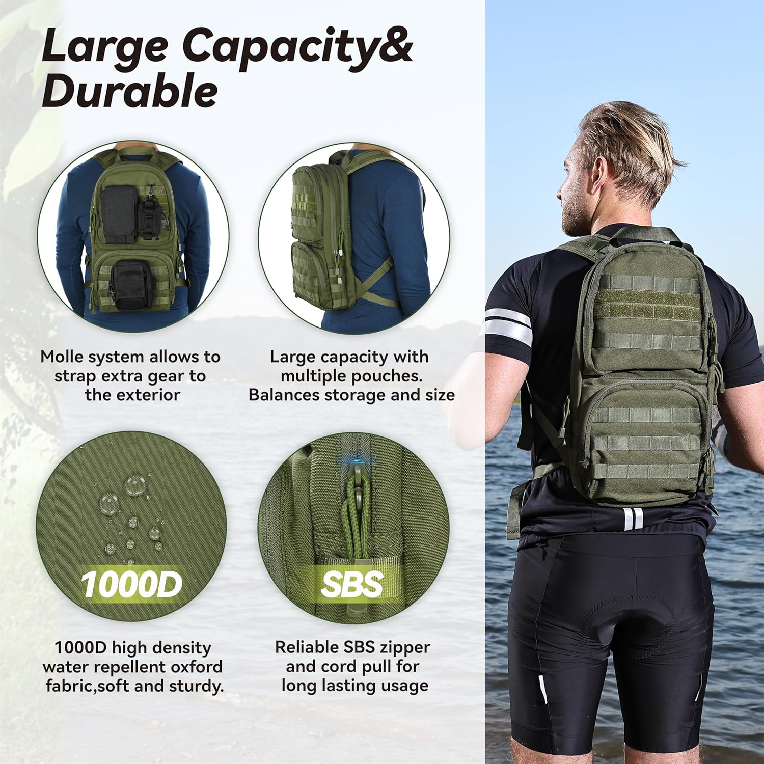 Sturdy and Durable: High-density 1000 Denier rugged nylon coated with PU, water repellent and wear resistant. Heavy duty plastic buckle is strong and tough; Military grade webbing is tear resistant; SBS zipper ensures smooth pulling and long-term use. High grade nylon threads make sewing firm and reliable.