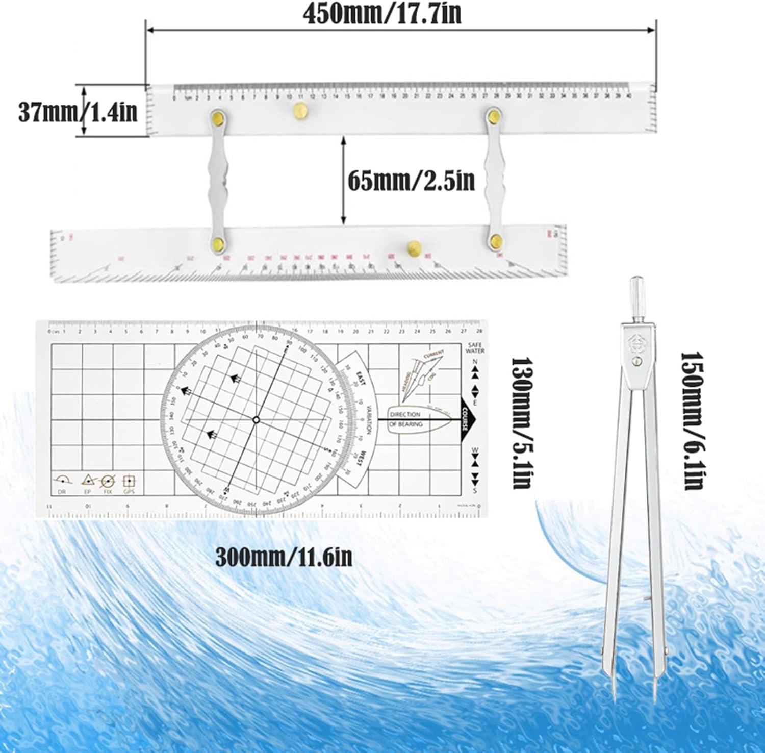3 Pcs Basic Navigation Set includes 16 Inch Marine Parallel Ruler,Nautical Protractor and 6 Inch Marine Fixed Points Divider for Boat, it helps you efficiently complete drawing, measuring, and marking,Marine Parallel Ruler made of 0.18-inch-thick acrylic, it features high transparency and clear scale, which facilitates observation and operation. Nautical Protractor made of transparent PVC, with clear and non-easily-damaged details, it is reusable.