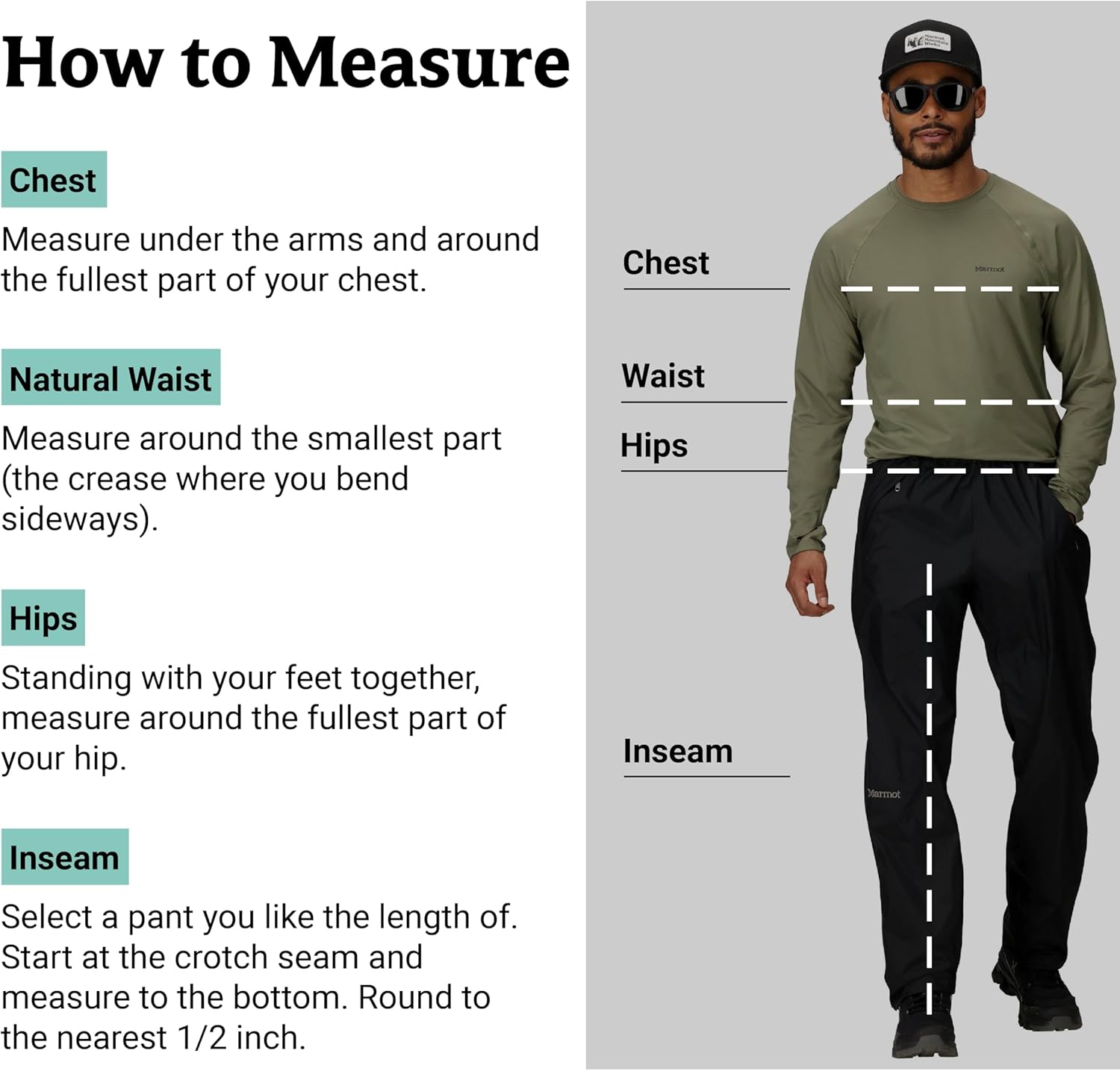 Customized Fit – Elastic waist with draw cord and full zip sides with bonded storm flaps lets you adjust fit as needed for comfort, mobility, and protection from the elements in the Marmot rain pants for men.